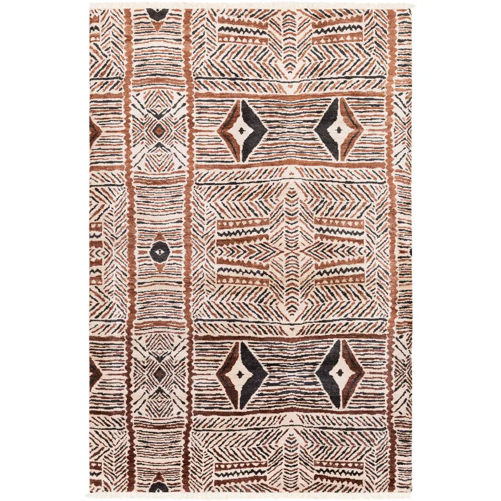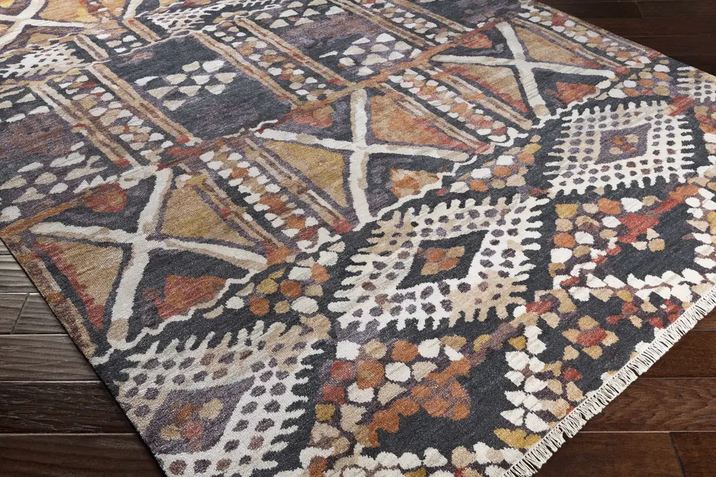 Collection: Lisbon Colors: Camel, Tan, Black, Mustard, Dark Red, Peach Construction: Hand Knotted Material: 85% Viscose,15% Wool Pile: Medium Pile Pile Height: 0.4" Styles: Bohemian/Global Made In: India Thickness: 0.5" Fringe Length: 1" Price Range: $$$$$ (Premium)