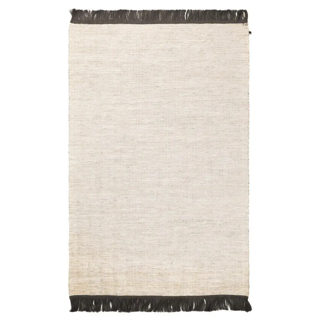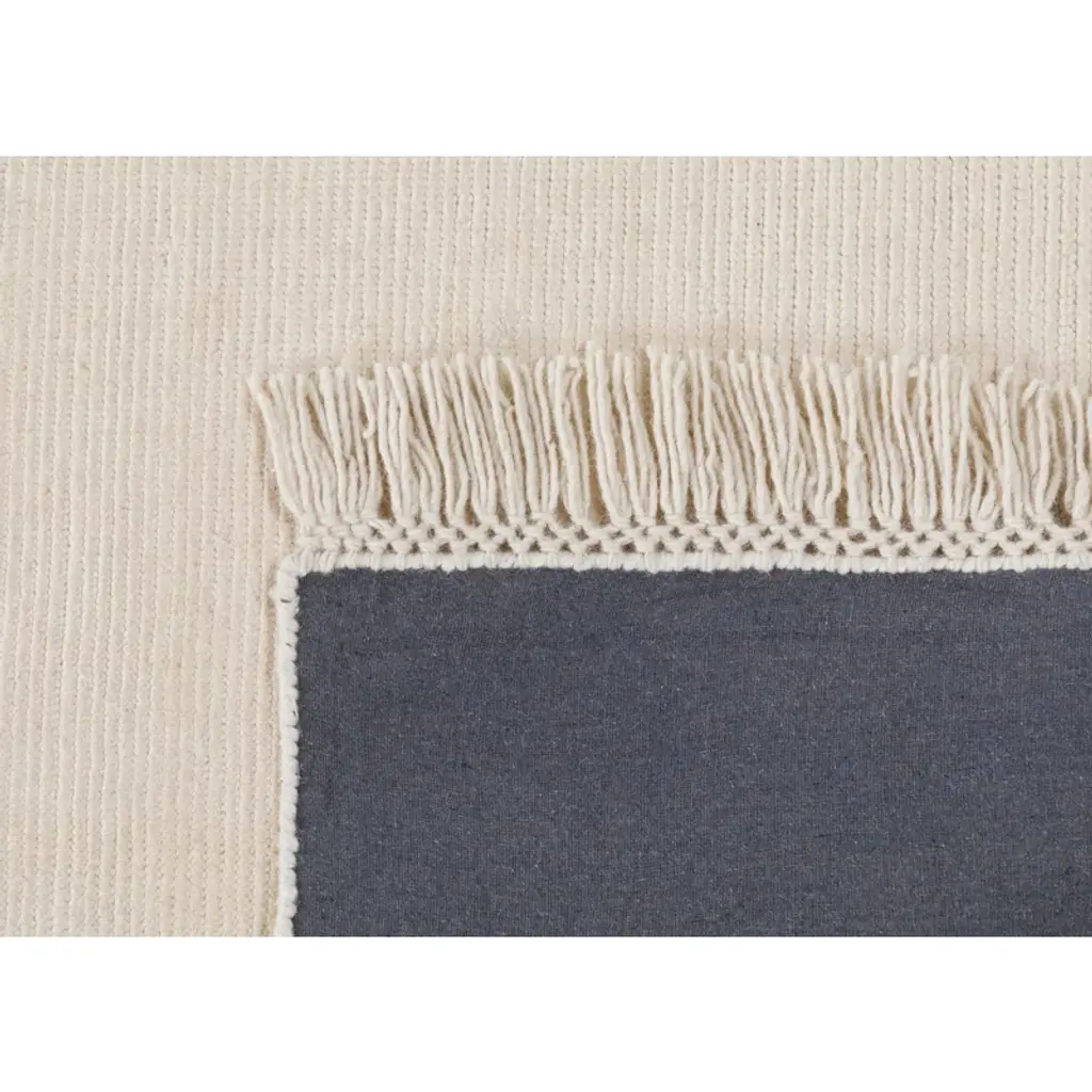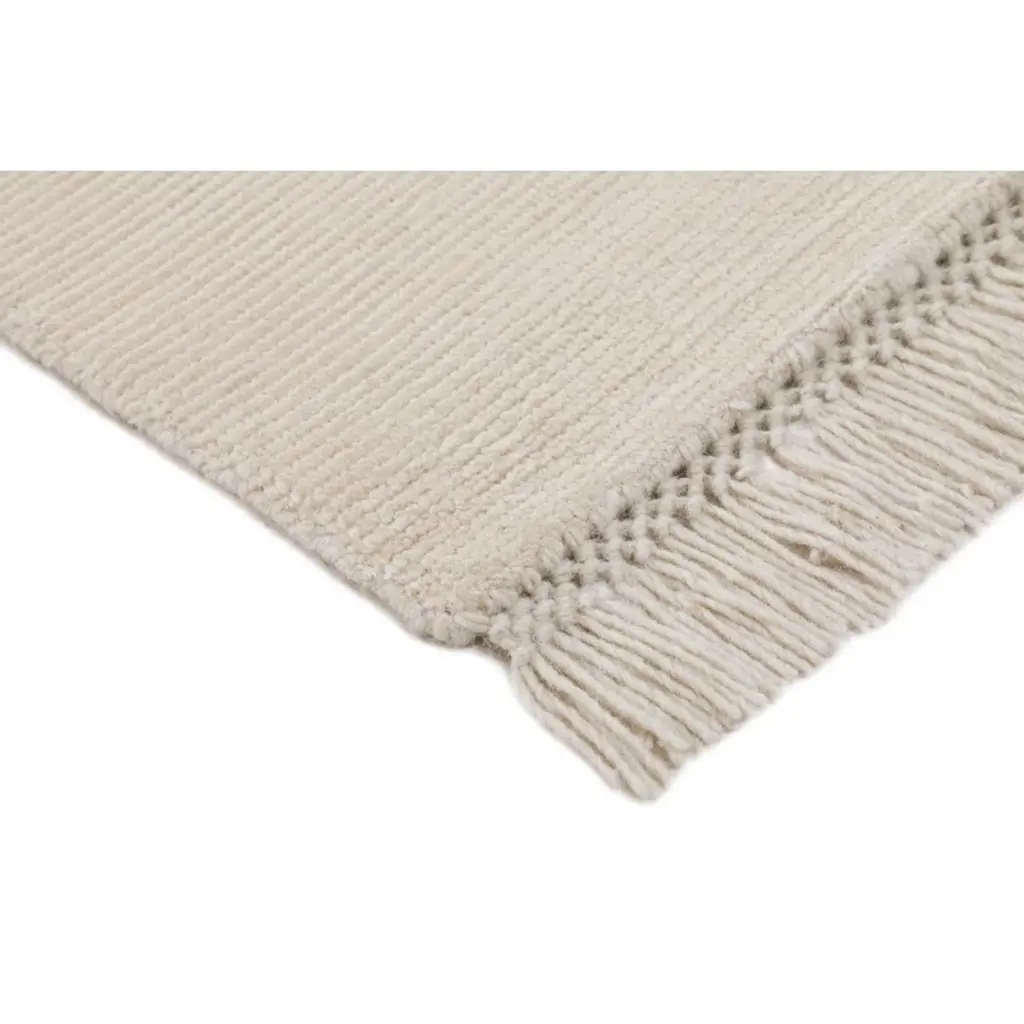 Elevate your living space with this hand-loomed, Dhurrie area rug. Made of wool and PET – a sustainable polyester constructed with recycled plastic – this rug is durable enough to withstand daily wear and tear in high traffic areas. We love how the neutral beige hue complements a range of decor styles (making it great for mixing and matching). Braided fringe along each end adds a playful finishing touch.