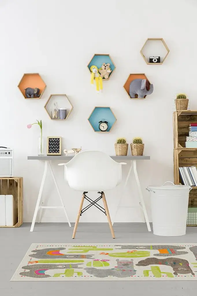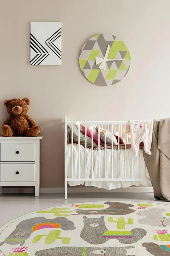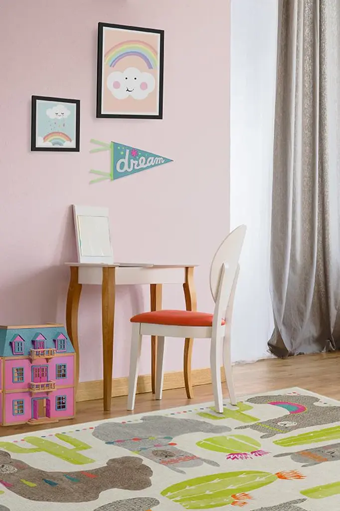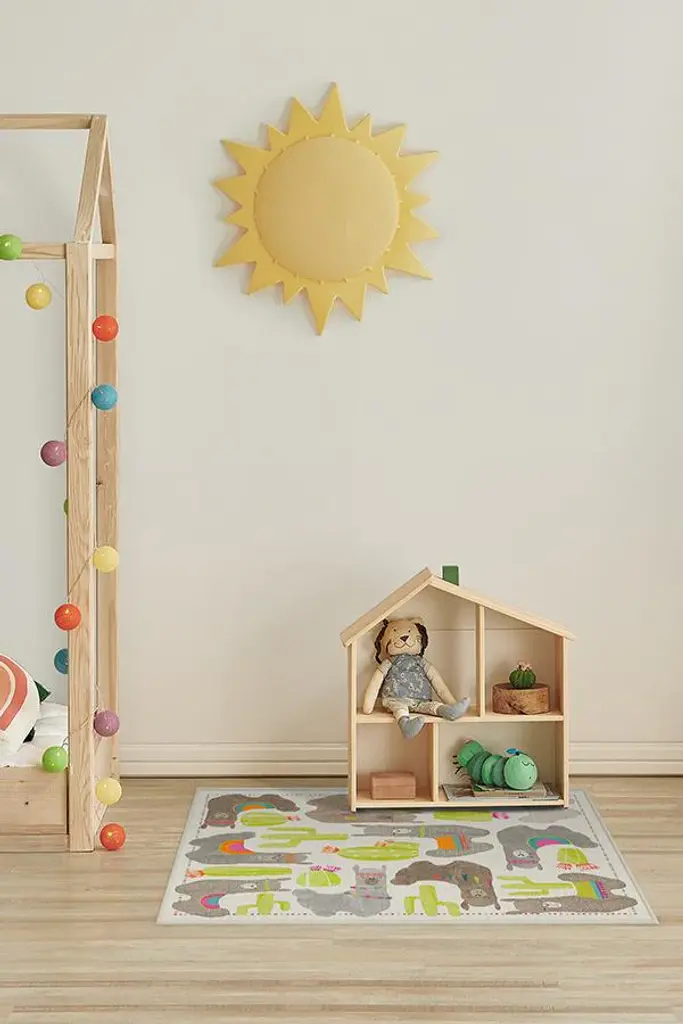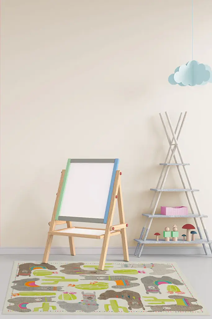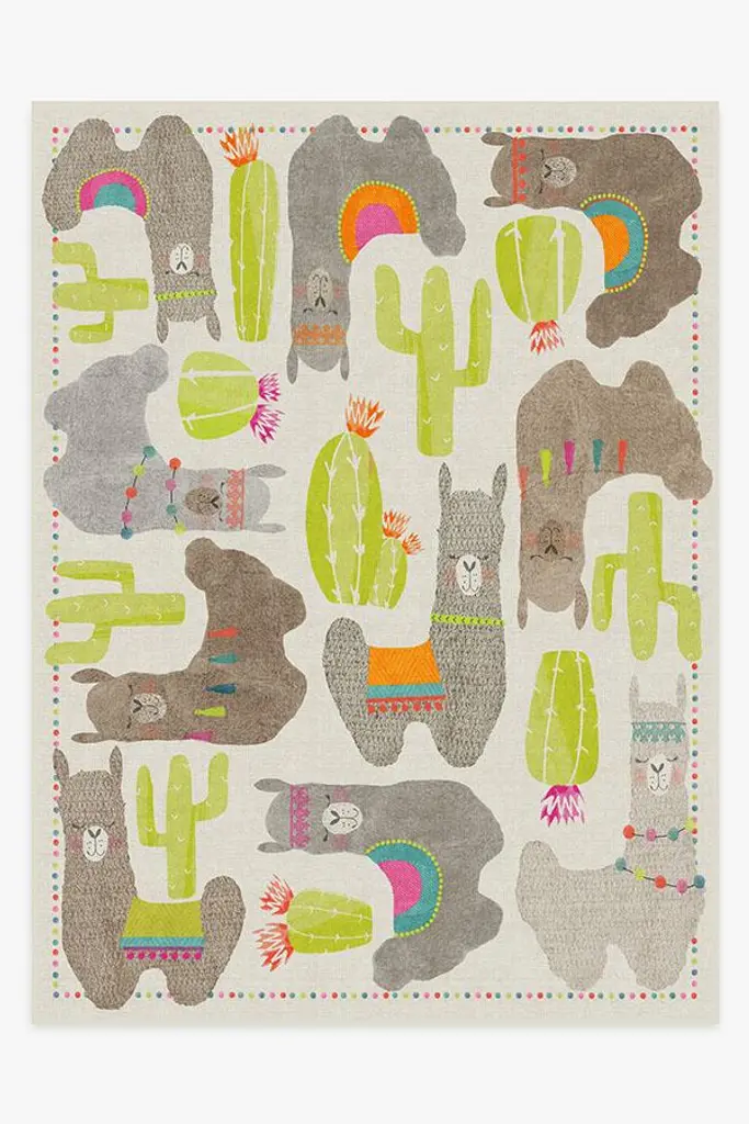 Adorned with sleepy, happy llamas draped in South American garlands and saddle blankets, our Llama Fun Natural Rug couldn't be sweeter. Wandering woolies and flowering cacti are accented in softly textured hues of mushroom, dove grey, and pops of neon chartreuse, lending a festive and celebratory design to any child's room.