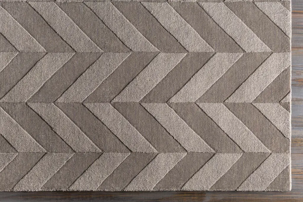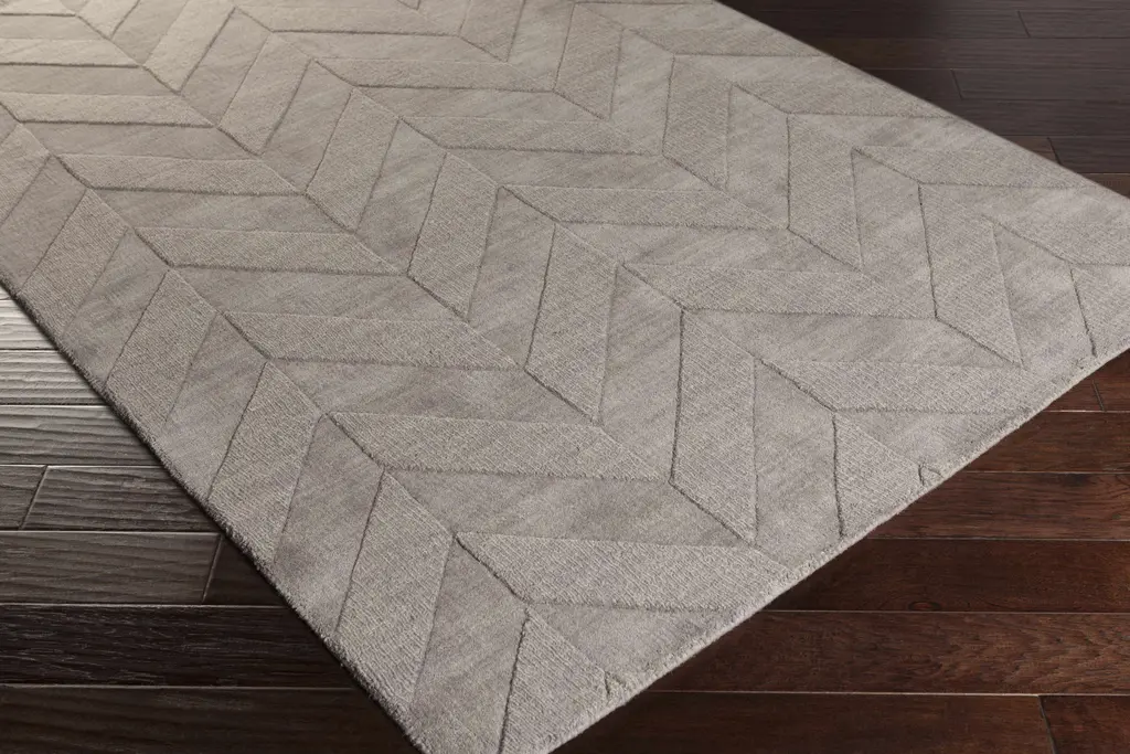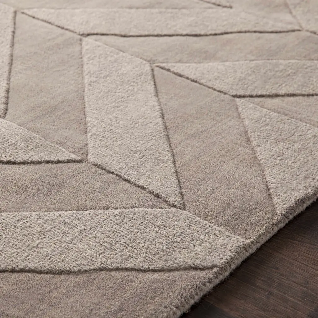Collection: Llewellyn Colors: Charcoal, Taupe Construction: Hand Loomed Material: 100% Wool Pile: Medium Pile Pile Height: 0.39" Styles: Contemporary Backing: Canvas Made In: India Thickness: 0.55" Price Range: $$$$$ (Affordable)