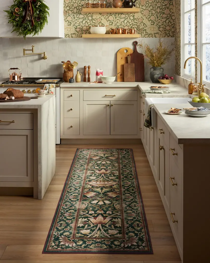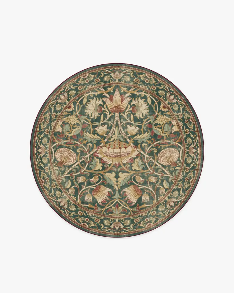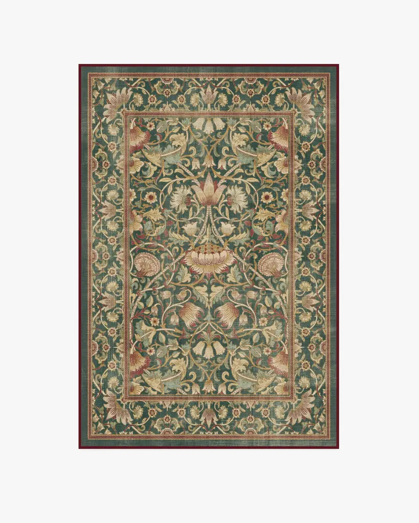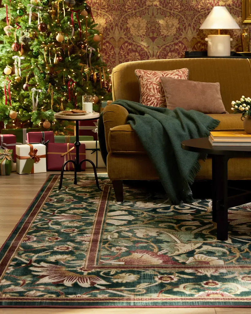Bring home a new take on timeless tradition with our Morris & Co. Lodden Soft Evergreen & Gold Rug. This festive design features rich, elegant scale-shifting florals and leaves, complemented by golden specks which evoke a subtle decadence. A central, intricately detailed medallion-like flower adds a traditional focal point, with surrounding motifs of dark ribbon reds, golds, subtle sages, and vintage creams contrasting beautifully against a deep evergreen background. This style is perfect for holiday gatherings or year-round enjoyment.