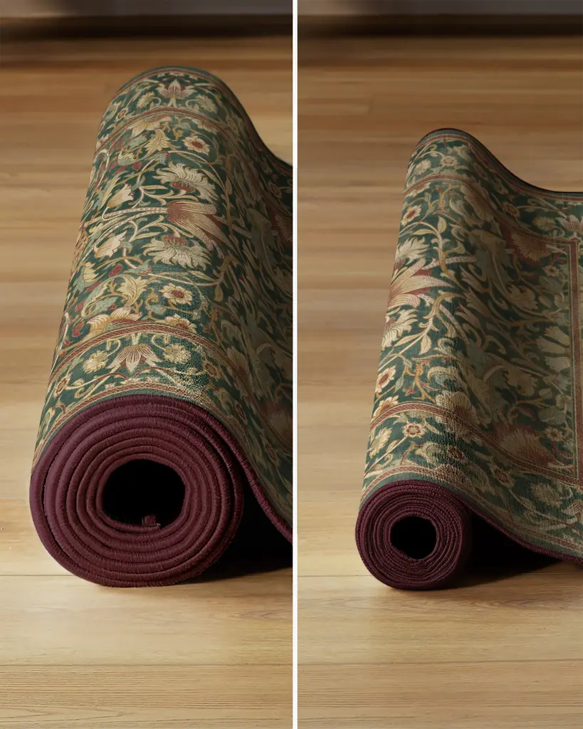 Bring home a new take on timeless tradition with our Morris & Co. Lodden Soft Evergreen & Gold Rug. This festive design features rich, elegant scale-shifting florals and leaves, complemented by golden specks which evoke a subtle decadence. A central, intricately detailed medallion-like flower adds a traditional focal point, with surrounding motifs of dark ribbon reds, golds, subtle sages, and vintage creams contrasting beautifully against a deep evergreen background. This style is perfect for holiday gatherings or year-round enjoyment.