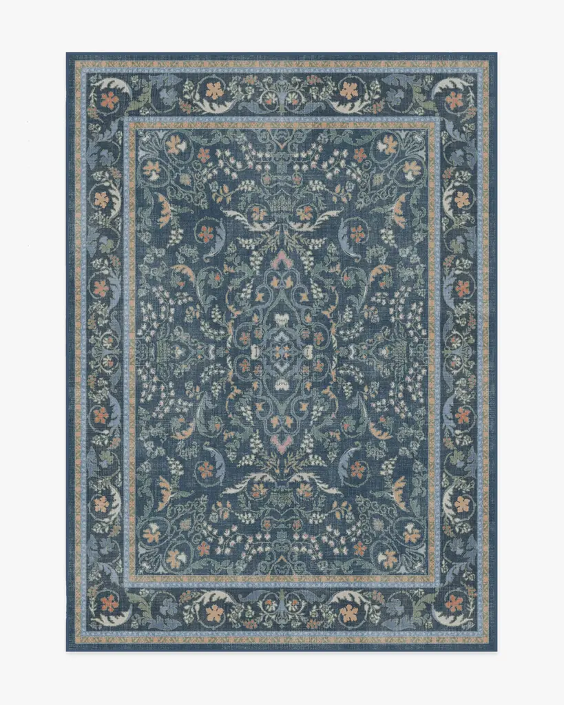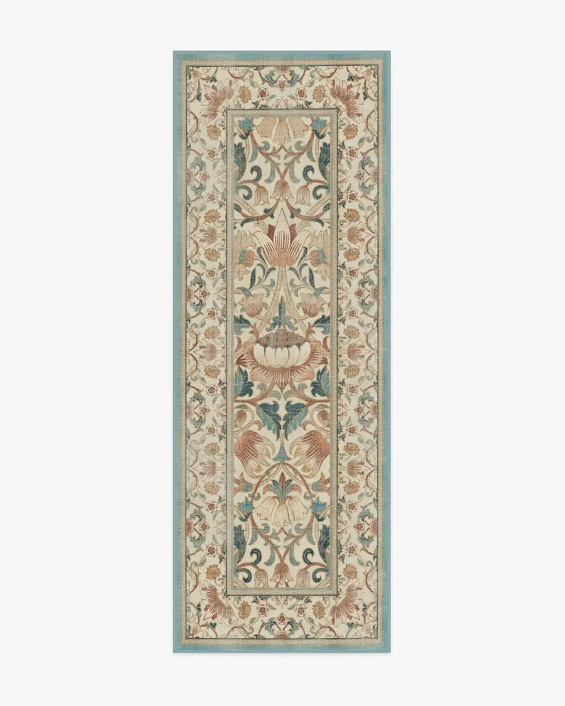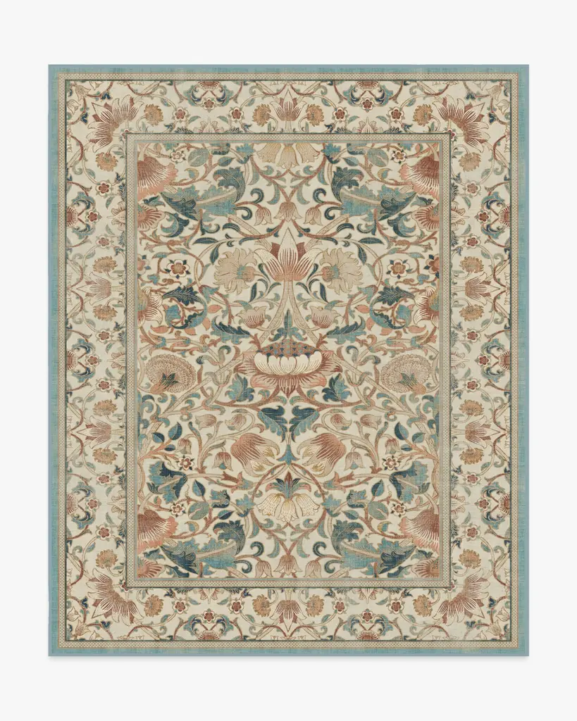 Enjoy life in full bloom with our Morris & Co. Lodden Soft Rose & Teal Rug. This fresh depiction of a classic William Morris design adds decadence to any room with its rich textures and golden hues. The intertwining florals expand from a central bloom, anchoring the composition in natural beauty. Teal blue and soft pink blooms layer on top of a classic cream background for an antique color palette. Water-resistant, stain-resistant, and machine-washable. Rug colors may vary slightly according to your device and the lighting in your space.