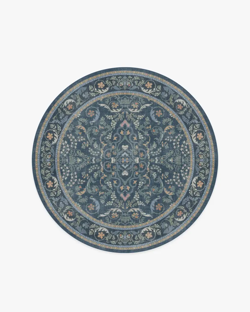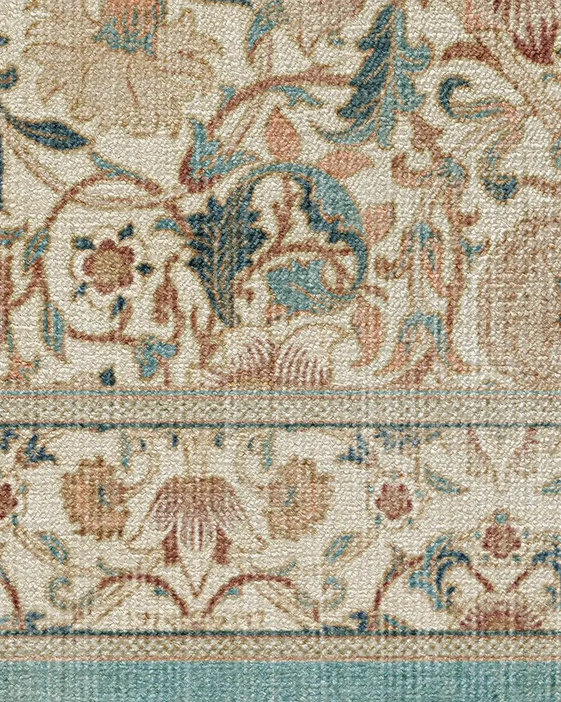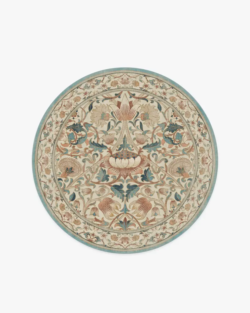 Enjoy life in full bloom with our Morris & Co. Lodden Soft Rose & Teal Rug. This fresh depiction of a classic William Morris design adds decadence to any room with its rich textures and golden hues. The intertwining florals expand from a central bloom, anchoring the composition in natural beauty. Teal blue and soft pink blooms layer on top of a classic cream background for an antique color palette. Water-resistant, stain-resistant, and machine-washable. Rug colors may vary slightly according to your device and the lighting in your space.