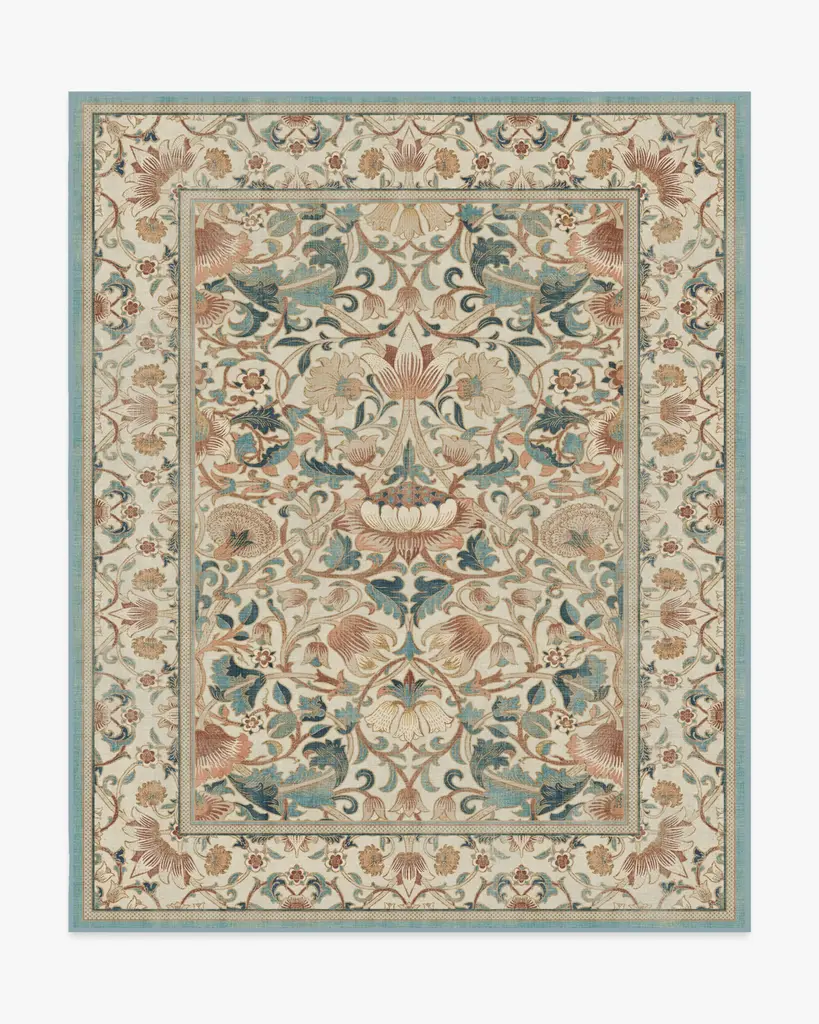 Enjoy life in full bloom with our Morris & Co. Lodden Soft Rose & Teal Rug. This fresh depiction of a classic William Morris design adds decadence to any room with its rich textures and golden hues. The intertwining florals expand from a central bloom, anchoring the composition in natural beauty. Teal blue and soft pink blooms layer on top of a classic cream background for an antique color palette. Water-resistant, stain-resistant, and machine-washable. Rug colors may vary slightly according to your device and the lighting in your space.