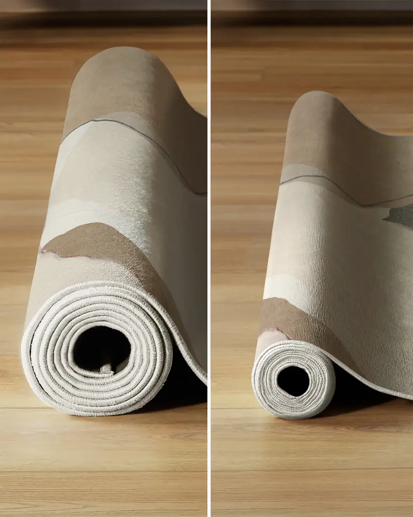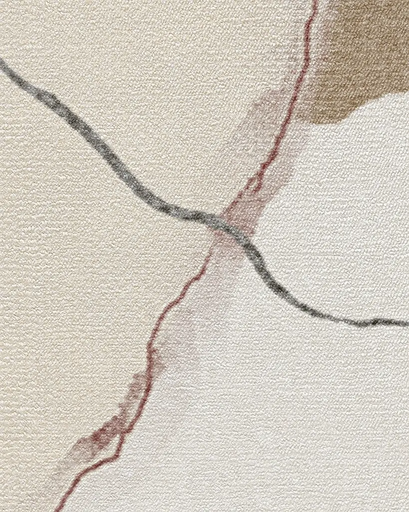 Subtle and stylish. Our Nina Takesh Loire Ivory Quartz Rug features an abstract swirl of shapes and lines in cream, dark grey, off-white, and deep dusty rose. Water-resistant, stain-resistant, and machine-washable.