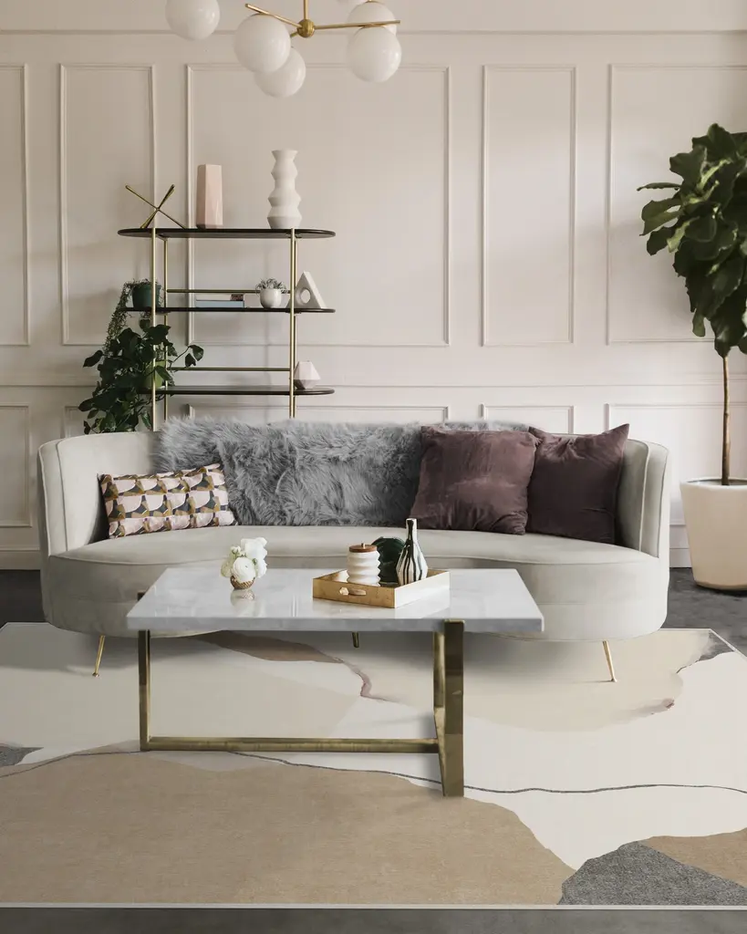 Subtle and stylish. Our Nina Takesh Loire Ivory Quartz Rug features an abstract swirl of shapes and lines in cream, dark grey, off-white, and deep dusty rose. Water-resistant, stain-resistant, and machine-washable.