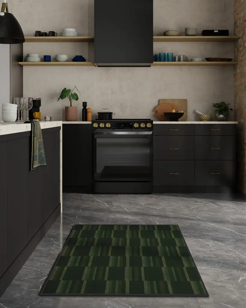 Embrace retro-modern artistry with our Michael Michalsky London Olive & Green Rug. Inspired by the nostalgic charm of London Underground seat covers and infused with a modern cubist twist, this geometric design balances tonal green hues to create a unique aesthetic. A perfect blend of vintage and contemporary elements, it's sure to add character and a hint of avant-garde style to any room. Water-resistant, stain-resistant, and machine-washable. Rug colors may vary slightly according to your device and the lighting in your space.