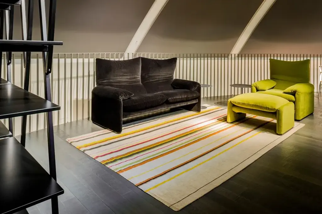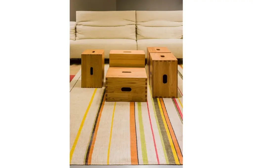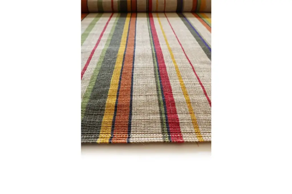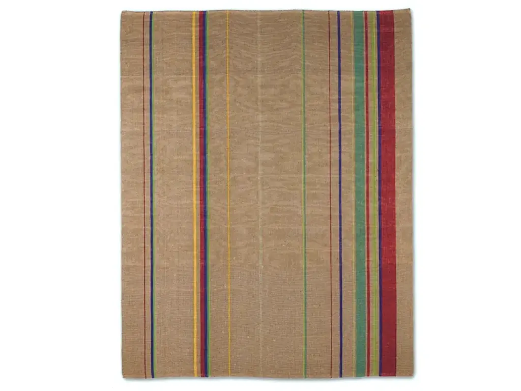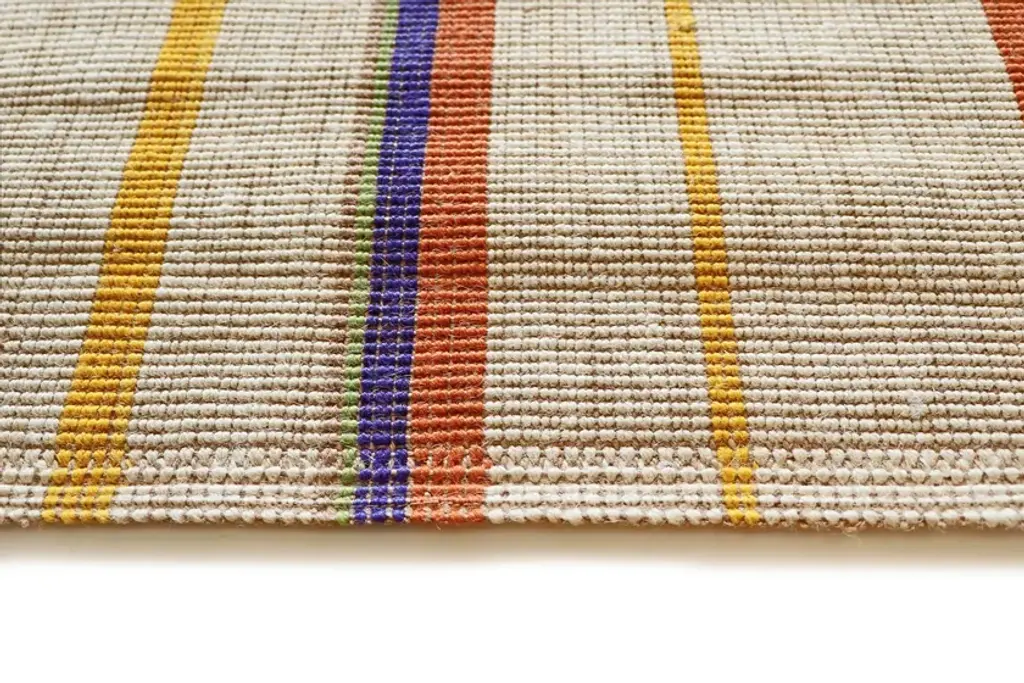 Ultra-thin rugs that rediscover a humble and dense material like jute and take advantage of the rhythm of colours to direct our gaze in space. The geometry of the stripes defines the setting interior and the rug becomes a meridian to orient the eye. Made in jute, a natural and sustainable fiber extracted for the cortical layer of an herbaceous plant, is known to have excellent hygroscopicity, or the capacity to absorb moisture in the air, and for being very resistant to wear and tear. For its natural crunchiness and pleasant rigidity, Loop is ideal for holiday homes.Material: jute - Structure: hand woven on traditional looms - Thickness: 5 mm -