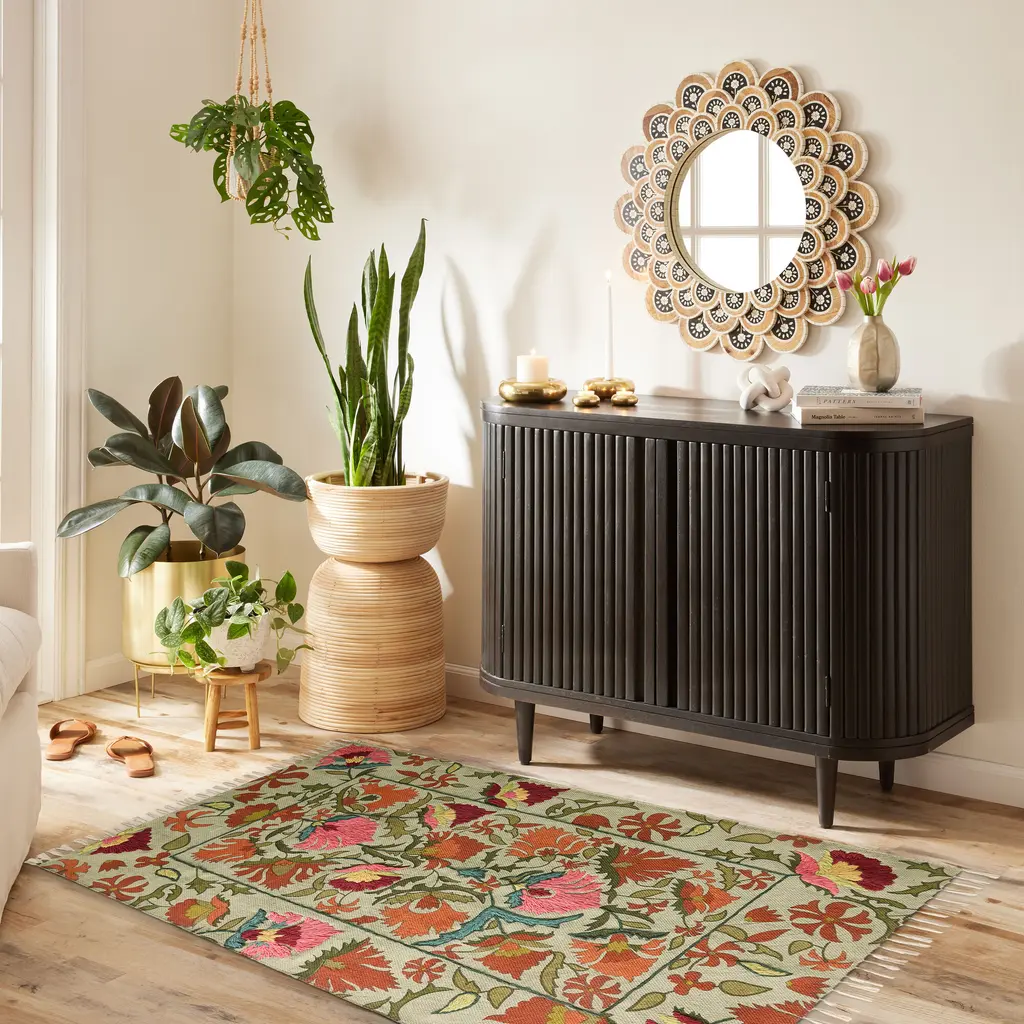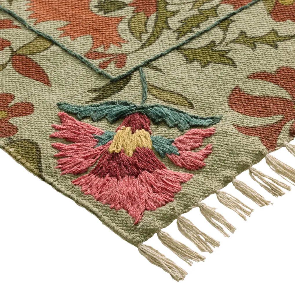 Expertly embroidered by Indian artisans, our lovely Lotus 3x5 cotton rug is screen printed with our exclusive floral design on a seafoam-green ground. Showcasing a lush color palette with lively pops of fuchsia and pink, each delicate flower petal and graceful leaf is embellished with hand-sewn embroidery. Finished with white tassels, every affordable Lotus area rug features subtle hand-stitched variations that highlight its unique character.