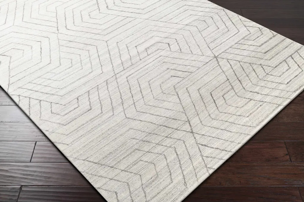 Collection: Luana Colors: Charcoal, Cream Construction: Hand Knotted Material: Face: 100% Viscose / Warp: 100% Cotton Pile: Medium Pile Pile Height: 0.38" Styles: Contemporary Made In: India Thickness: 0.45" Price Range: $$$$$ (Premium)