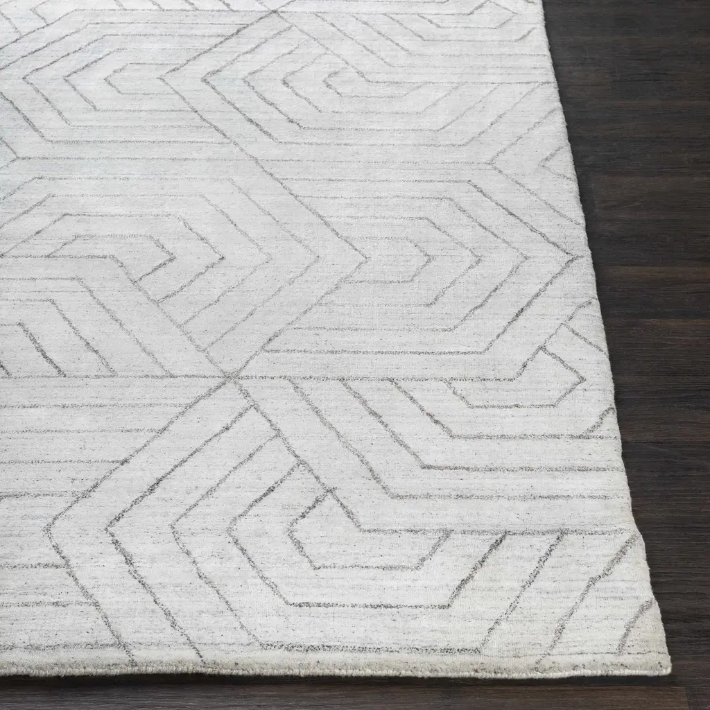 Collection: Luana Colors: Charcoal, Cream Construction: Hand Knotted Material: Face: 100% Viscose / Warp: 100% Cotton Pile: Medium Pile Pile Height: 0.38" Styles: Contemporary Made In: India Thickness: 0.45" Price Range: $$$$$ (Premium)