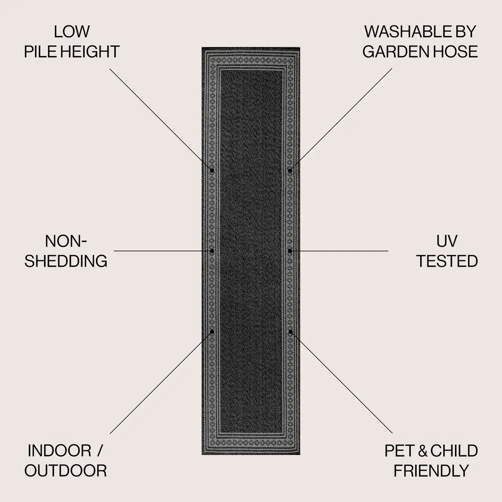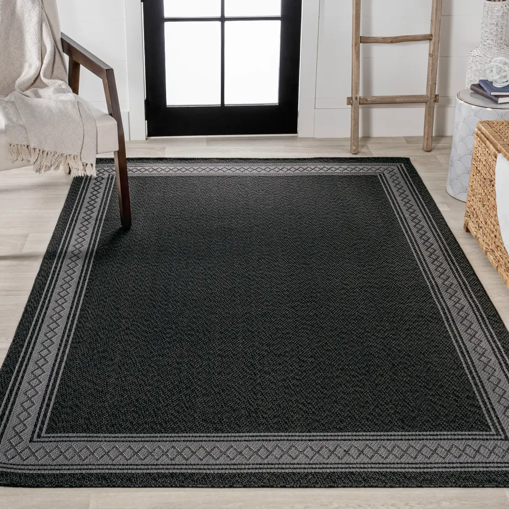 Classic meets modern in our unique solid rug with its diamond geometric border. The two-tone design is woven into a durable, low pile indoor-outdoor rug. This pet-friendly rug will add punch to your living room, dining room, bedroom, or porch.