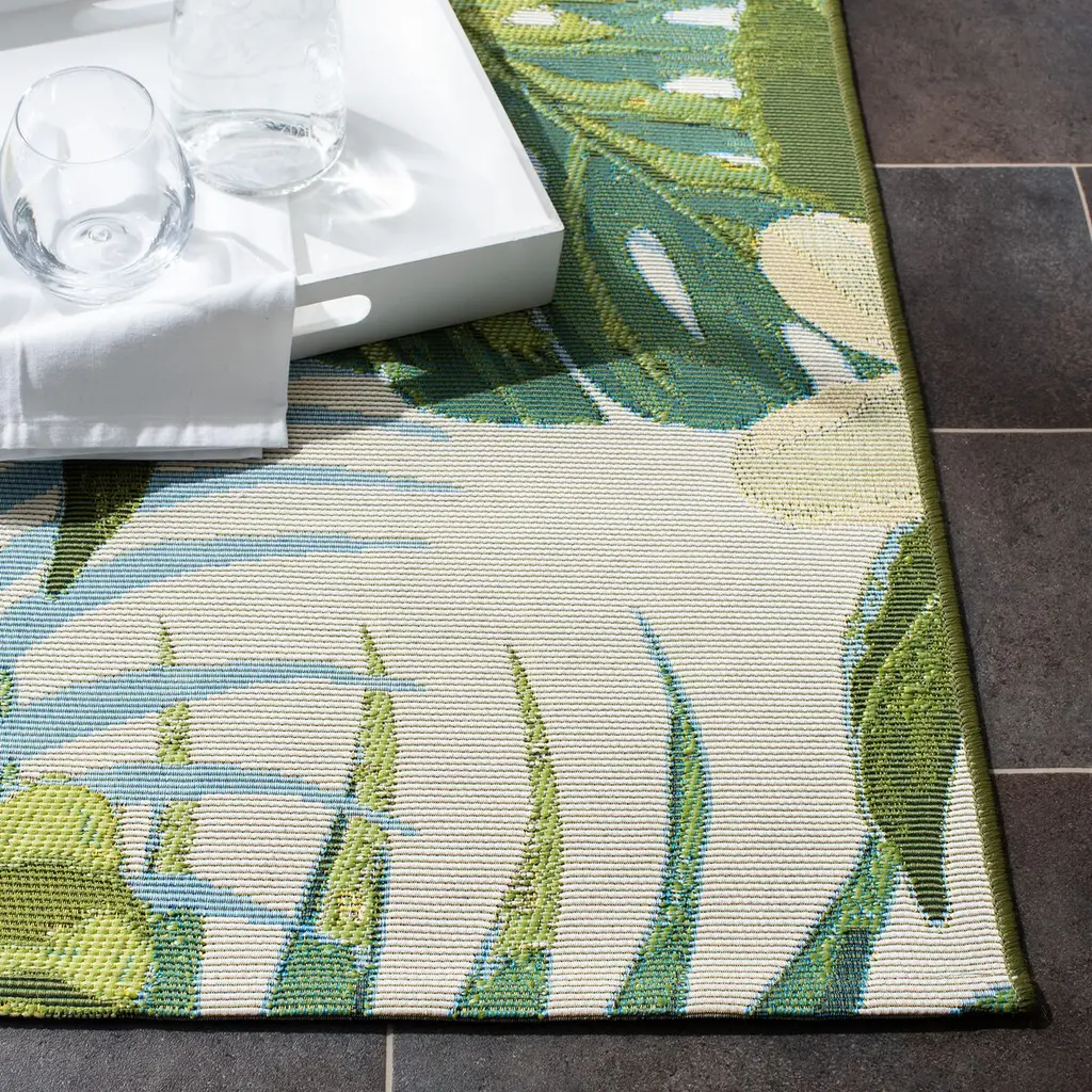 Introduce a burst of color and nature-inspired design to your home with our exquisite medium rectangle area rug. This charming rug showcases a lovely floral pattern, featuring blush-tinted pink hibiscus blooms and sunny yellow flora amidst a lush backdrop of verdant leaves, meticulously woven to create a serene tropical ambiance. Crafted with care on a power loom, this rug boasts a masterful construction of 76% Polypropylene, 23% Polyester, and 1% backing material, lending durability for both indoor and outdoor settings. The pile height of 1/4" provides a delicate underfoot sensation while ensuring easy maintenance and resilience against foot traffic and the elements. Proudly made in Egypt, this area rug speaks volumes of its superb craftsmanship and enduring quality. Perfect for adding a touch of sophistication to your patio, living room, or sunroom, this rug is OEKO-TEX certified, ensuring it meets high safety and environmental standards, and is free from harmful substances. Transform your space into a tranquil retreat with this enchanting area rug, a timeless addition to any decor seeking to balance comfort with elegance.