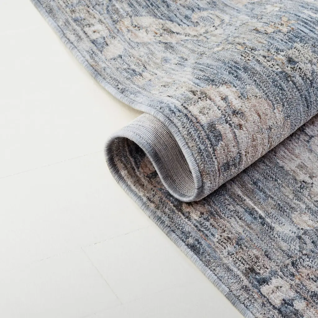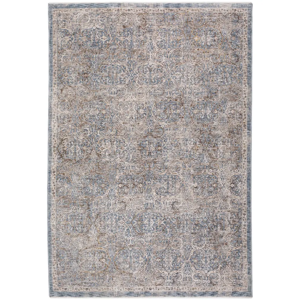 Elevate your living space with the timeless elegance of our Transitional Style Area Rug. Expertly crafted in Turkey, this medium rectangle rug measures 5'3" x 7'6" and boasts a comfortable pile height of 1/4". Featuring a power-loomed polyester pile, this rug promises durability and easy maintenance. Adorned in a serene palette of blue and ivory beige, the rug showcases a blend of traditional motifs and distressed elements, creating a harmonious balance between classic and contemporary. The intricate pattern, inspired by the image, exhibits versatile floral and geometric designs that can seamlessly integrate into a variety of decors, making it an ideal choice for any room. Its transitional style is perfect for those who appreciate the fusion of modernity with classic charm. Whether placed in a busy living area or as a focal point in a dining room, this area rug is sure to enhance your home with its sophisticated allure and soft underfoot experience. Indulge in the beauty and craftsmanship of a rug that is not only visually captivating but also constructed to withstand the test of time.