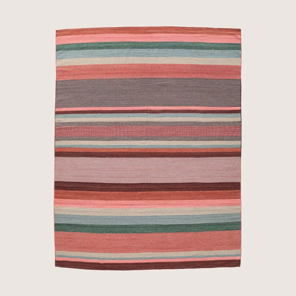 Charm never goes out of style. In a joyful palette of flatwoven stripes, this RWS-certified wool-and-cotton rug layers warmth and cheer into any room. It’s feel-good flooring.