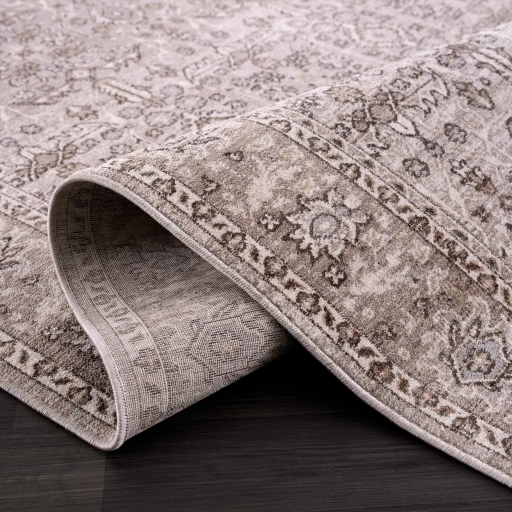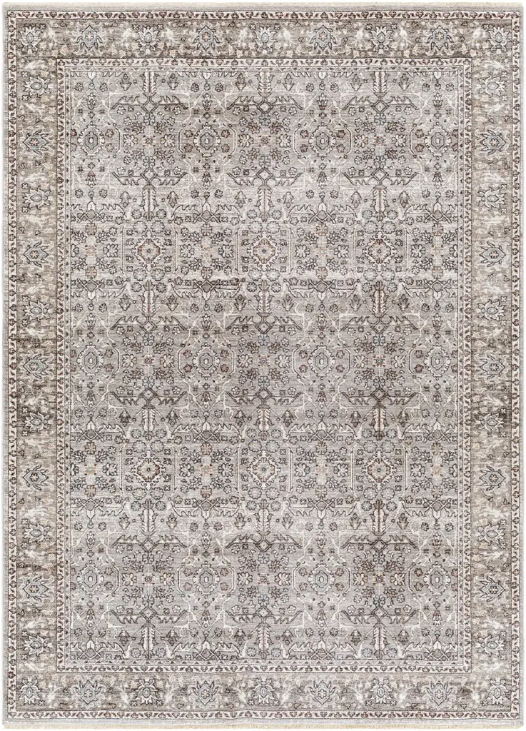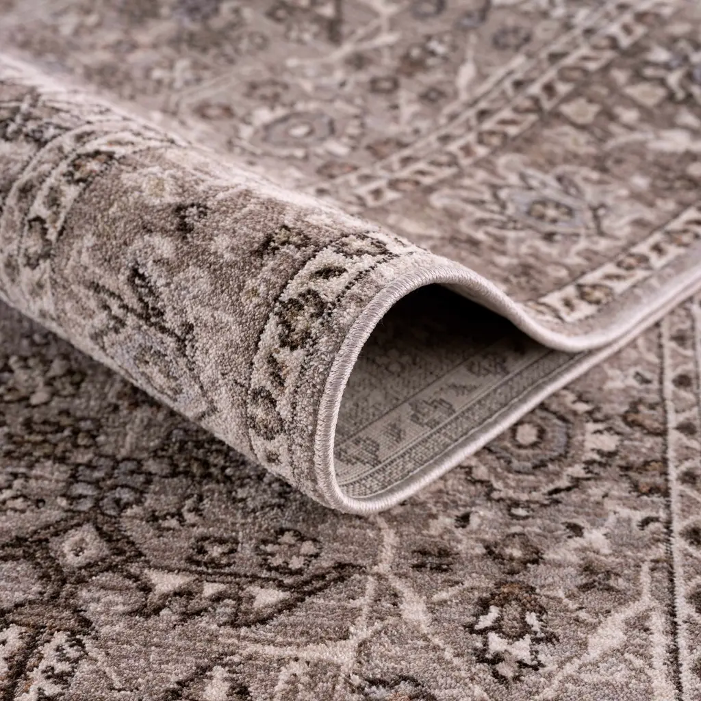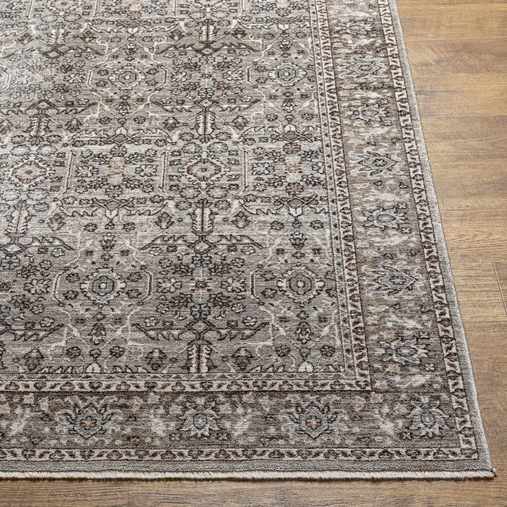 Collection: Lugo Colors: Charcoal, Ivory, Medium Gray, Light Gray, Dusty Pink, Pale Blue Construction: Machine Woven Material: 100% Polyester Pile: Medium Pile Pile Height: 0.22" Styles: Traditional Made In: Turkey Thickness: 0.41" Fringe Length: 0.1" Price Range: $$$$$ (Affordable)