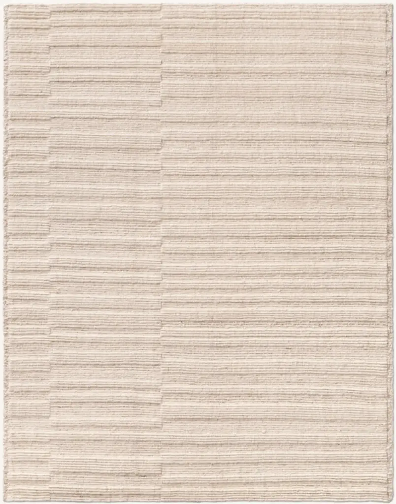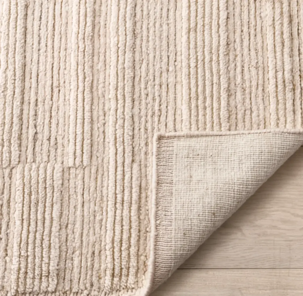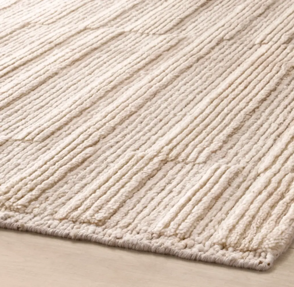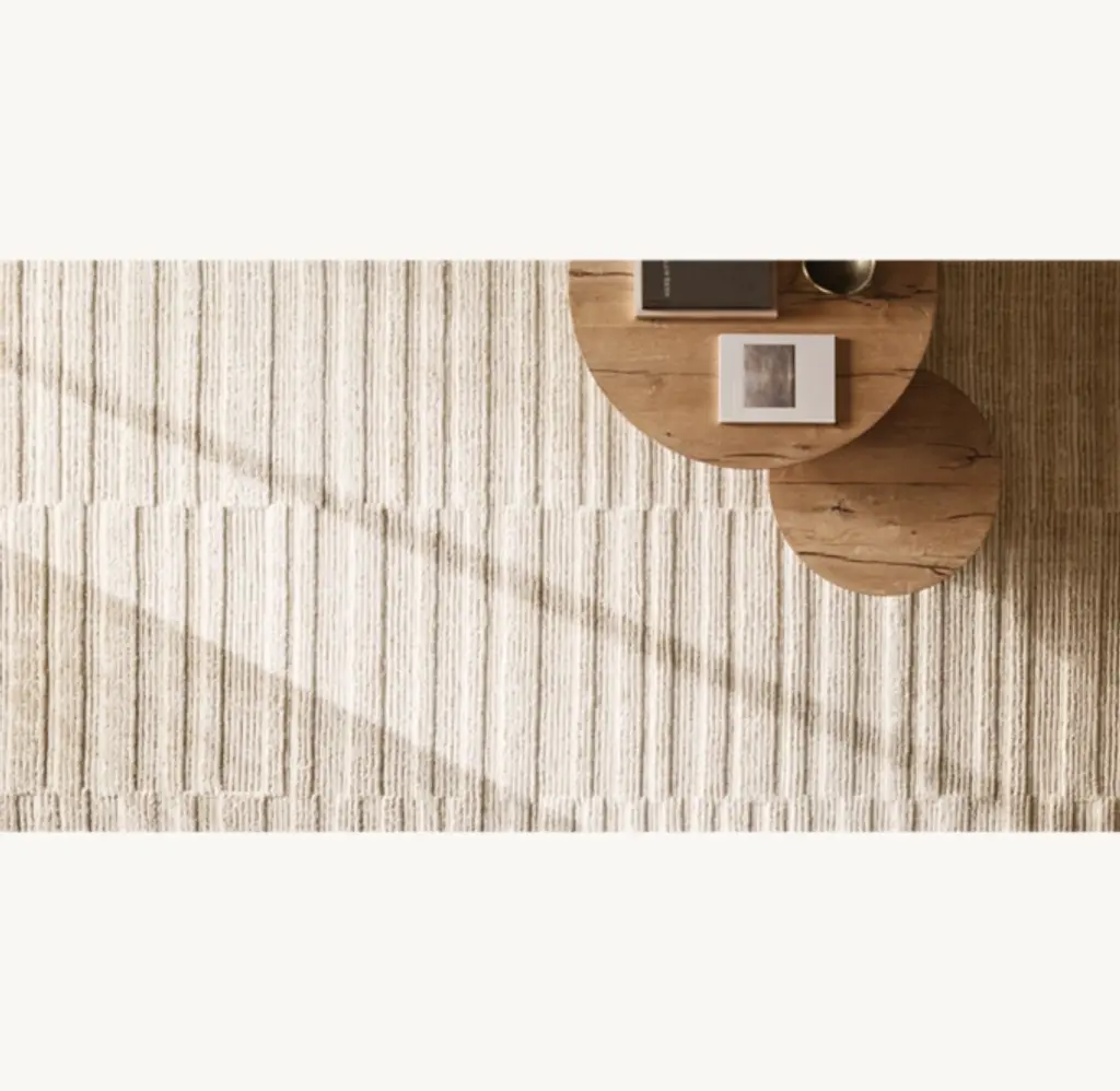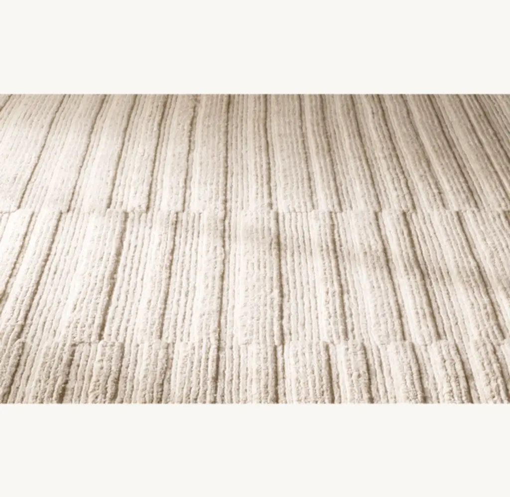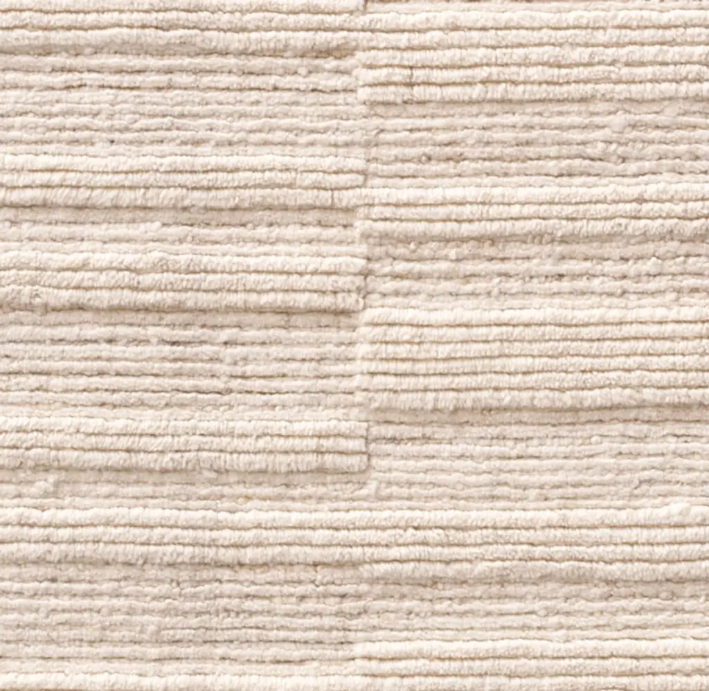 Tonal shading and high-low dimension lend visual depth to Luis's offset lines. Fine wool yarns are hand woven on traditional looms, then sheared into ultra-fine rows for a dense feel and soft finish.