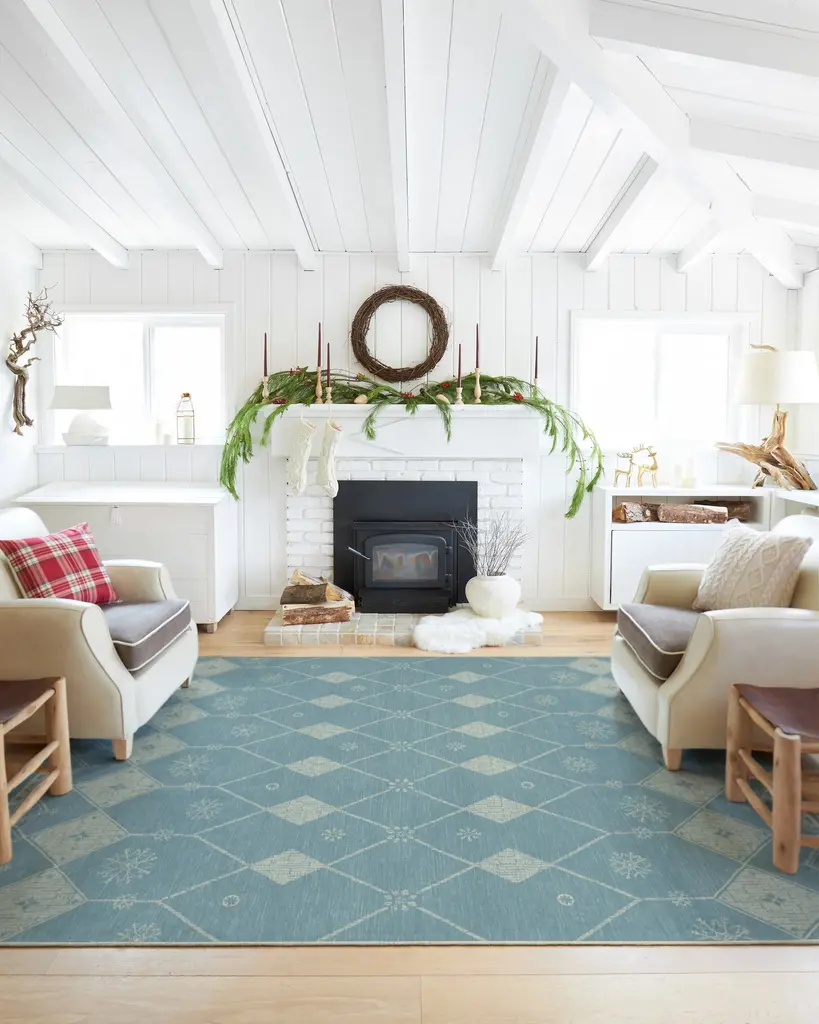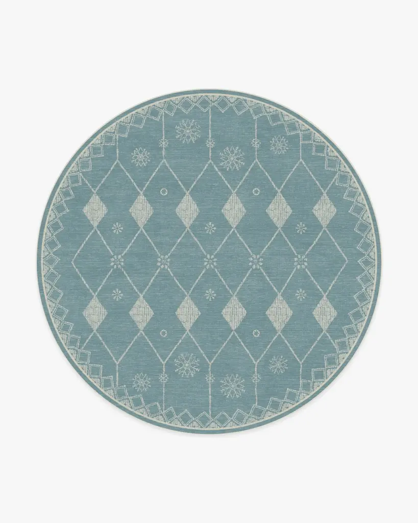 Get ready to make snow angels on our Lumia Pale Blue Rug. Inspired by delicate, falling snow, this wintry design features a calming pale blue background with subtle cream snowflake and diamond motifs reminiscent of frost-covered landscapes. Water-resistant, stain-resistant, and machine-washable. Rug colors may vary slightly according to your device and the lighting in your space.