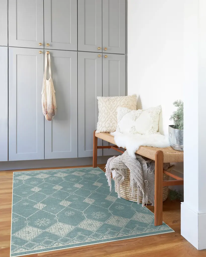 Get ready to make snow angels on our Lumia Pale Blue Rug. Inspired by delicate, falling snow, this wintry design features a calming pale blue background with subtle cream snowflake and diamond motifs reminiscent of frost-covered landscapes. Water-resistant, stain-resistant, and machine-washable. Rug colors may vary slightly according to your device and the lighting in your space.