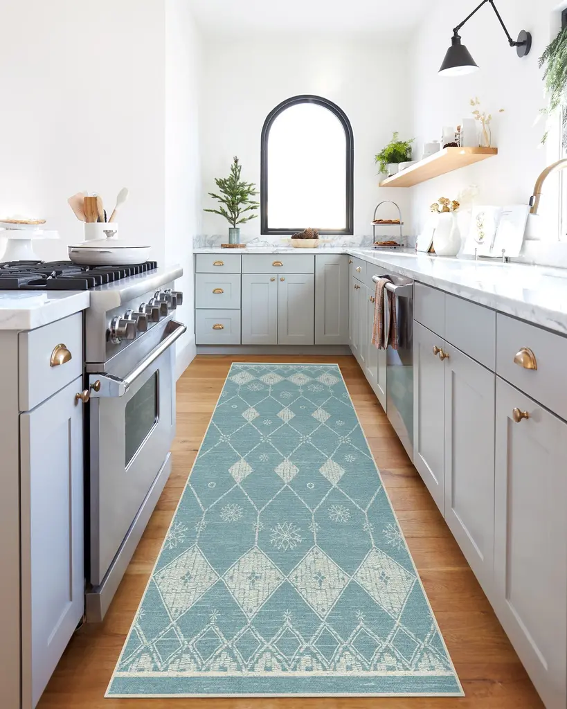 Get ready to make snow angels on our Lumia Pale Blue Rug. Inspired by delicate, falling snow, this wintry design features a calming pale blue background with subtle cream snowflake and diamond motifs reminiscent of frost-covered landscapes. Water-resistant, stain-resistant, and machine-washable. Rug colors may vary slightly according to your device and the lighting in your space.
