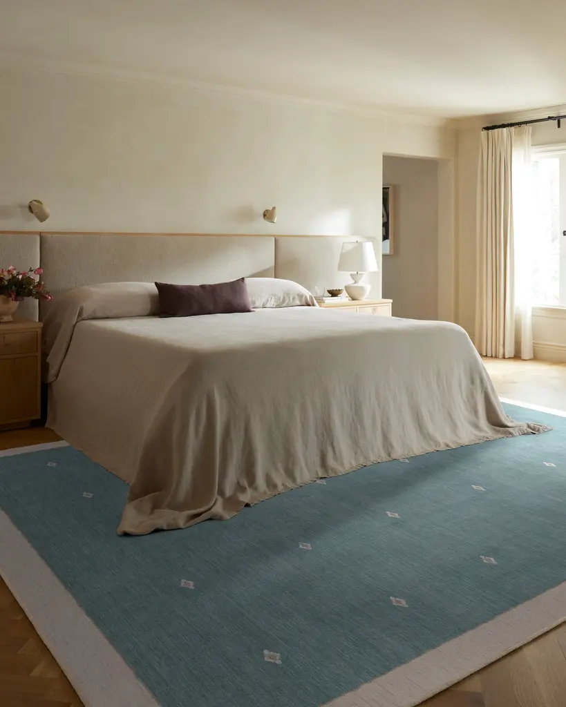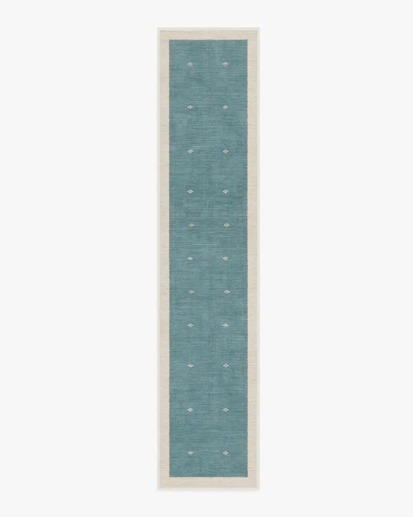 Bask in the glimmer of diamonds with our goop Luna Soft Teal Rug. Inspired by Indian dhurrie designs, this obsession-worthy style features clean and simple borders adorned with symmetrical, micro-patterned diamonds. Each light cream motif elegantly pops against a soft turquoise background, bringing livable luxury to any room. Water-resistant, stain-resistant, and machine-washable. Rug colors may vary slightly according to your device and the lighting in your space.