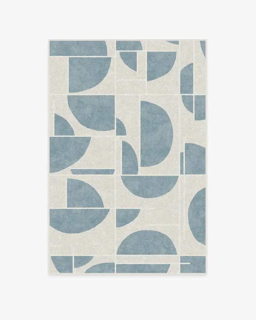 Dreamy like the night sky. Our Nina Takesh Lune Slate Blue Rug was designed with the lunar phases in mind and features light grey-blue circular shapes and lines interacting with each other on a soft pearly grey background. Water-resistant, stain-resistant, and machine-washable.
