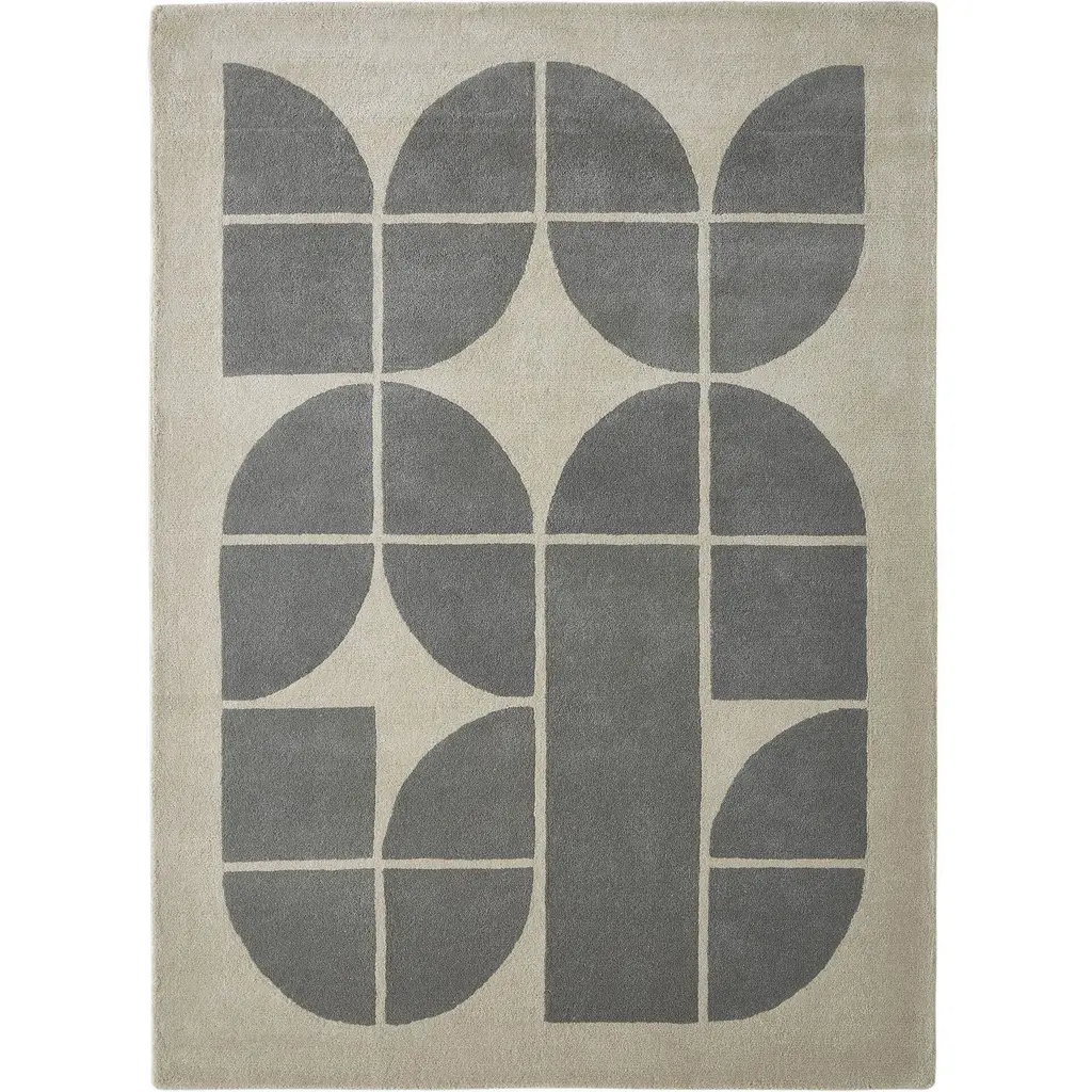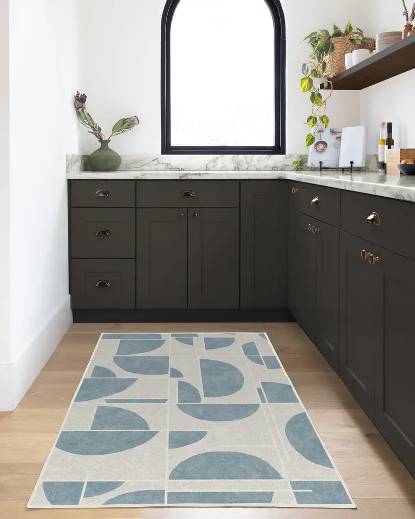 Dreamy like the night sky. Our Nina Takesh Lune Slate Blue Rug was designed with the lunar phases in mind and features light grey-blue circular shapes and lines interacting with each other on a soft pearly grey background. Water-resistant, stain-resistant, and machine-washable.