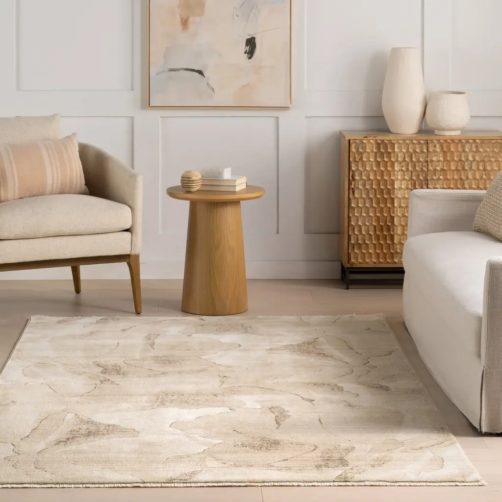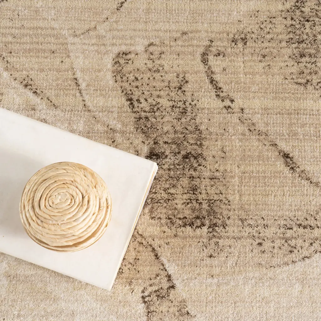 Abstract shapes and soft, muted tones take center stage in this design, using neutrals paired with contrasting accents to create a unique, eye-catching look. Its versatile topographic-inspired pattern makes it an ideal foundation that complements a wide range of decor styles.