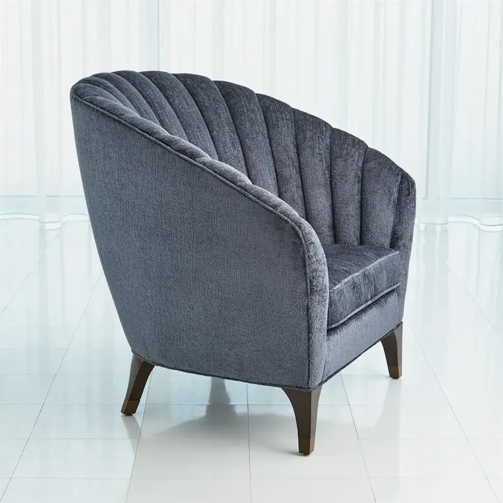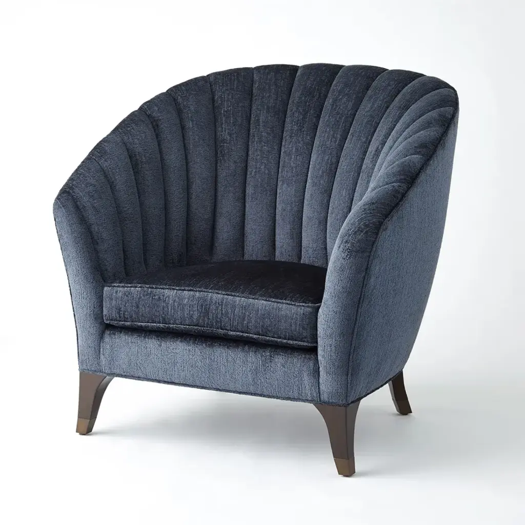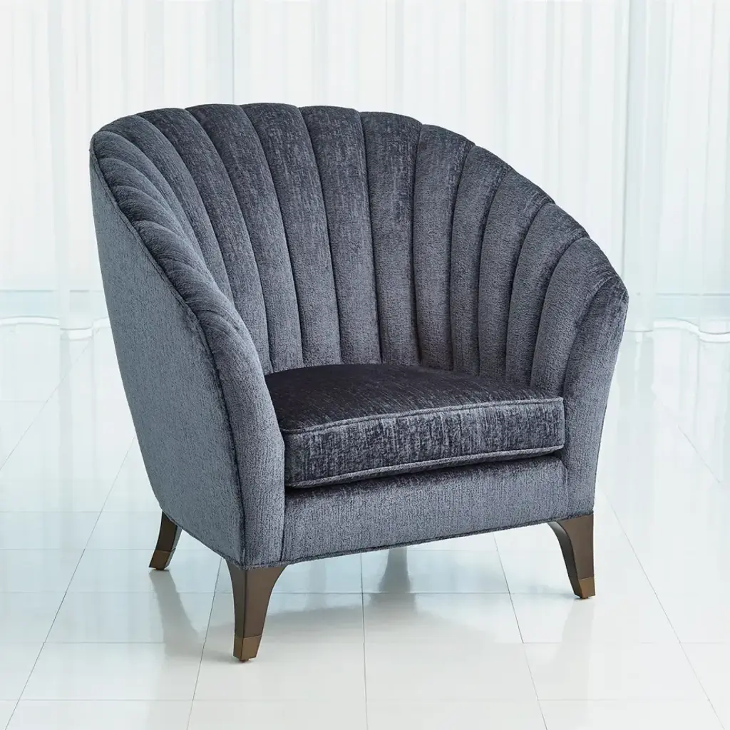 Our take on the scallop back chair, the Luxe Lounge chair offers style and comfort to any space. Covered in a chenille-like indigo fabric with walnut legs and brass sabots, the Luxe Lounge will fit beautifully in any space. Also available in muslin. From a fashion forward perspective, Global Views offers accessories, furniture, statement lighting, and an assortment of rugs and mirrors to add beauty and joy to your home.
