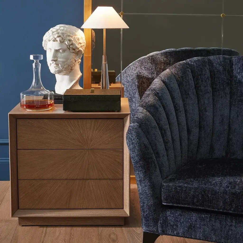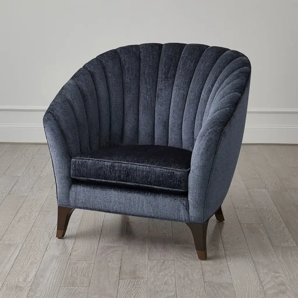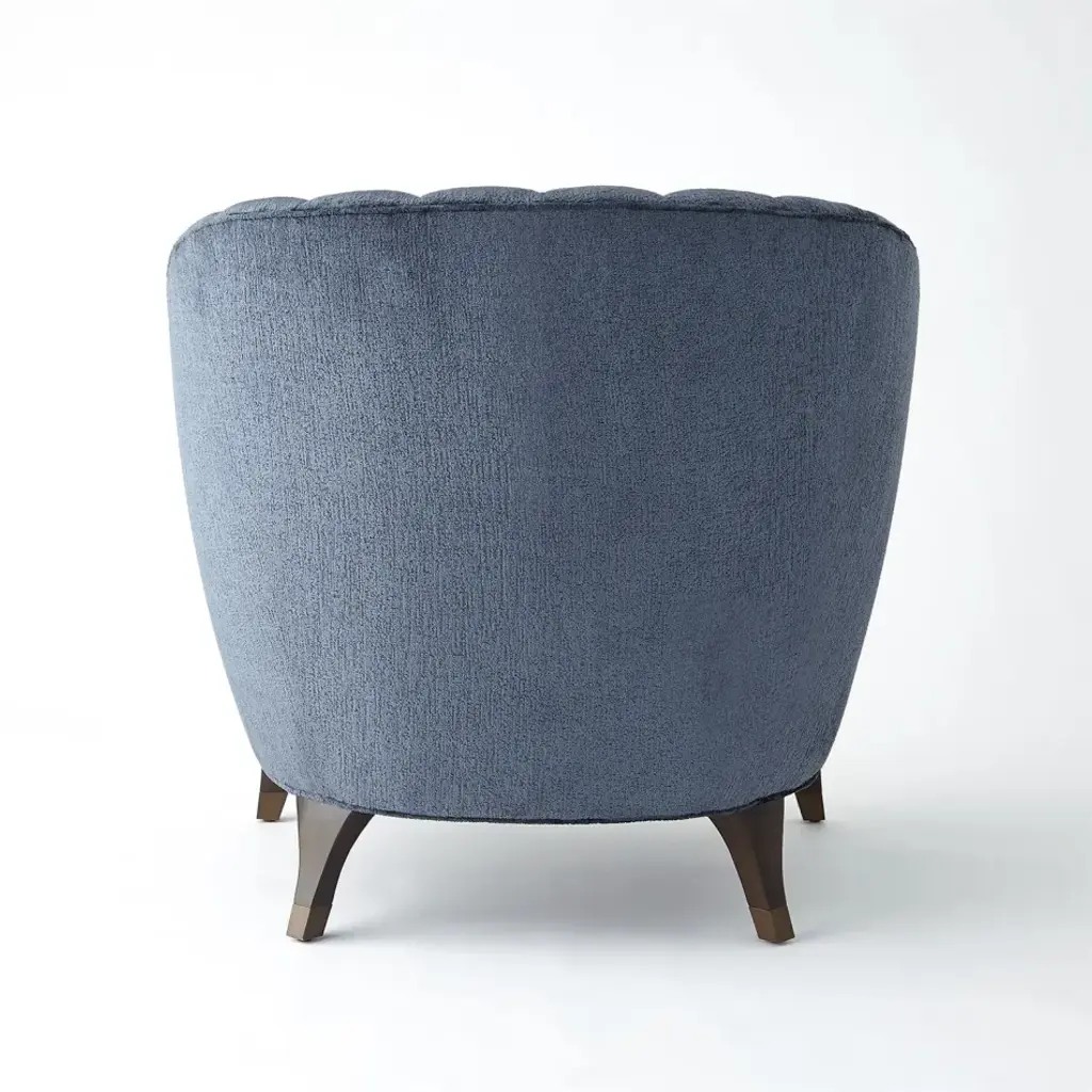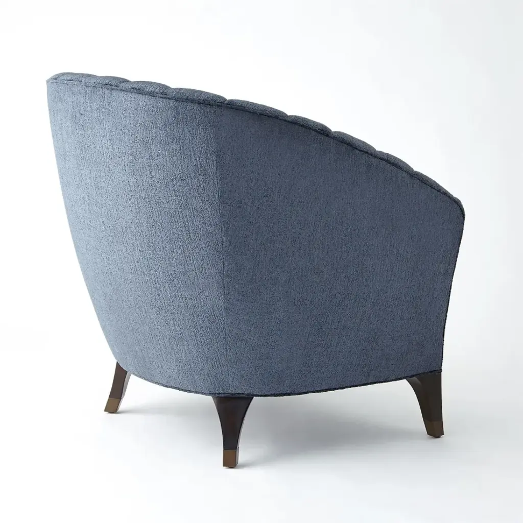 Our take on the scallop back chair, the Luxe Lounge chair offers style and comfort to any space. Covered in a chenille-like indigo fabric with walnut legs and brass sabots, the Luxe Lounge will fit beautifully in any space. Also available in muslin. From a fashion forward perspective, Global Views offers accessories, furniture, statement lighting, and an assortment of rugs and mirrors to add beauty and joy to your home.