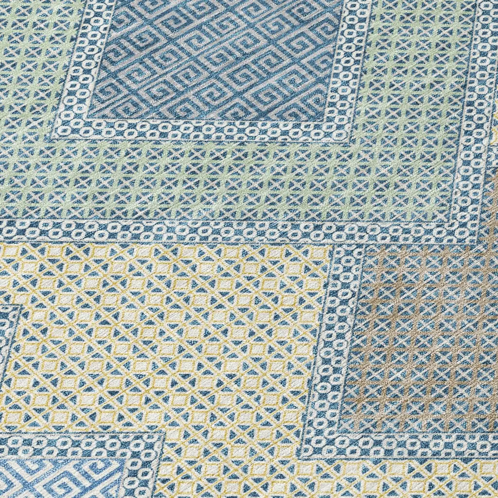 Reimagine your living spaces with a transitional masterpiece embellished with geometric triangles bordered by a beautifully crafted frame. Its ultra thin, flat weave construction, combined with UV stabilization, makes it an excellent choice for both indoor and outdoor settings. Designed for modern living, it features a non-skid backing and is machine washable, ensuring it remains a family and pet-friendly favorite without the need for an extra rug pad. All rugs exposed to long periods of intense and direct sunlight can experience loss of color over time. Our rugs perform best in covered outdoor areas and uncovered areas with lower hours of direct sunlight. The ultra thin profile allows for fast drying after rainfall or outdoor cleaning. Larger rug sizes may not fit into a residential washing machine. They may be washed in a commercial size washing machine or hosed-off outside with mild soap and water. Air-dry, do not machine dry. While each rug already has a non-skid backing, the necessity for additional cushion or room settings with high traction areas, may require an additional rug pad.