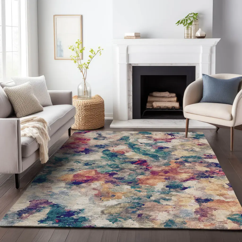 Immerse your space in a world of vibrant color and creativity with our transitional masterpiece, showcasing bold abstract paint splashes that dance across its surface. Engineered with an ultra-thin, flat weave and a clever non-skid backing, there's no need for an extra pad, ensuring a seamless fit indoors or outdoors thanks to its UV stabilization. Machine washable for effortless care, it's the ideal family and pet-friendly choice, making it as practical as it is visually striking. All rugs exposed to long periods of intense and direct sunlight can experience loss of color over time. Our rugs perform best in covered outdoor areas and uncovered areas with lower hours of direct sunlight. The ultra thin profile allows for fast drying after rainfall or outdoor cleaning. Larger rug sizes may not fit into a residential washing machine. They may be washed in a commercial size washing machine or hosed-off outside with mild soap and water. Air-dry, do not machine dry. While each rug already has a non-skid backing, the necessity for additional cushion or room settings with high traction areas, may require an additional rug pad.