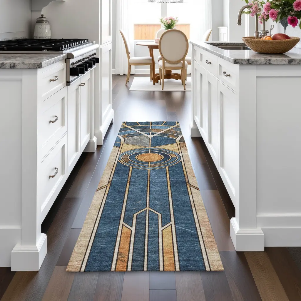 Discover a piece that beautifully blends transitional style with a geometric pattern of multi-shapes, creating an enchanting illusion of layers. The ultra-thin, flat woven design is not only aesthetically pleasing but offers practical versatility with UV stabilization for indoor and outdoor charm. Its machine washable nature and non-skid backing make it a family and pet-friendly addition to any space, eliminating the extra fuss of a separate rug pad. All rugs exposed to long periods of intense and direct sunlight can experience loss of color over time. Our rugs perform best in covered outdoor areas and uncovered areas with lower hours of direct sunlight. The ultra thin profile allows for fast drying after rainfall or outdoor cleaning. Larger rug sizes may not fit into a residential washing machine. They may be washed in a commercial size washing machine or hosed-off outside with mild soap and water. Air-dry, do not machine dry. While each rug already has a non-skid backing, the necessity for additional cushion or room settings with high traction areas, may require an additional rug pad.
