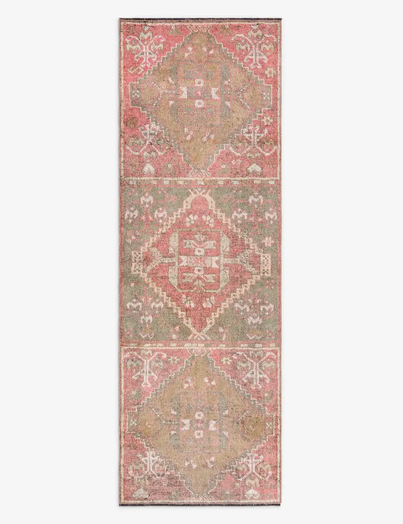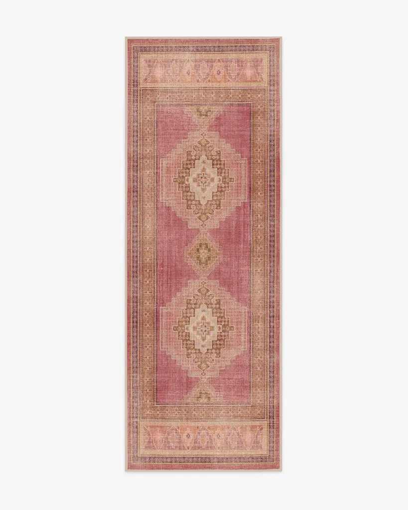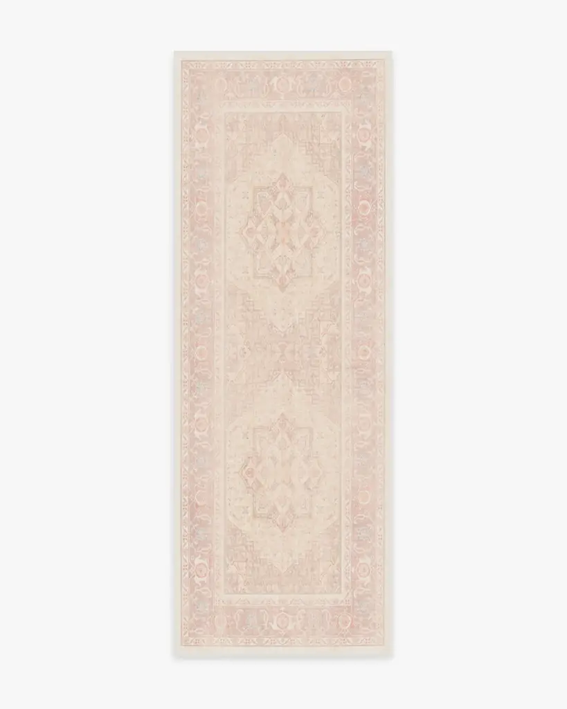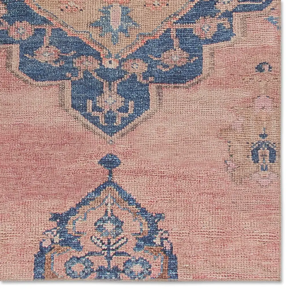 This Southwestern-inspired area rug provides endless charm and durability—the medallion pattern grounds spaces in tones of pink, blue, tan, and gray. Digitally printed on a 100% polyester base with traction backing, this rug can withstand high-traffic areas such as entryways, bathrooms, and kitchens.