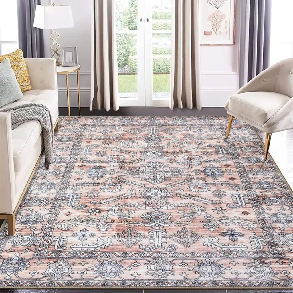 Machine Washable Vintage Distressed Floral Printed Area Rug Low Pile Stain Resistant Non Slip Non Shedding Pet Friendly Rugs For Living Room Bedroom