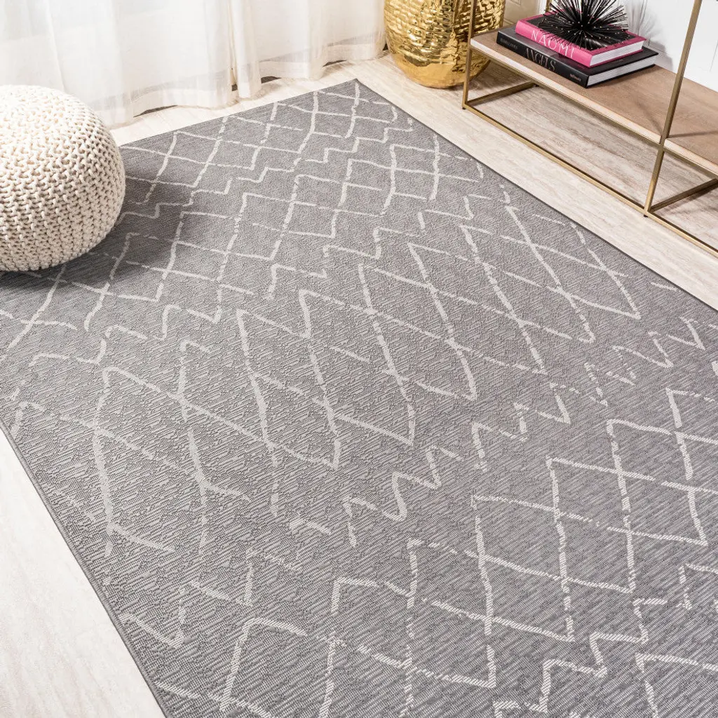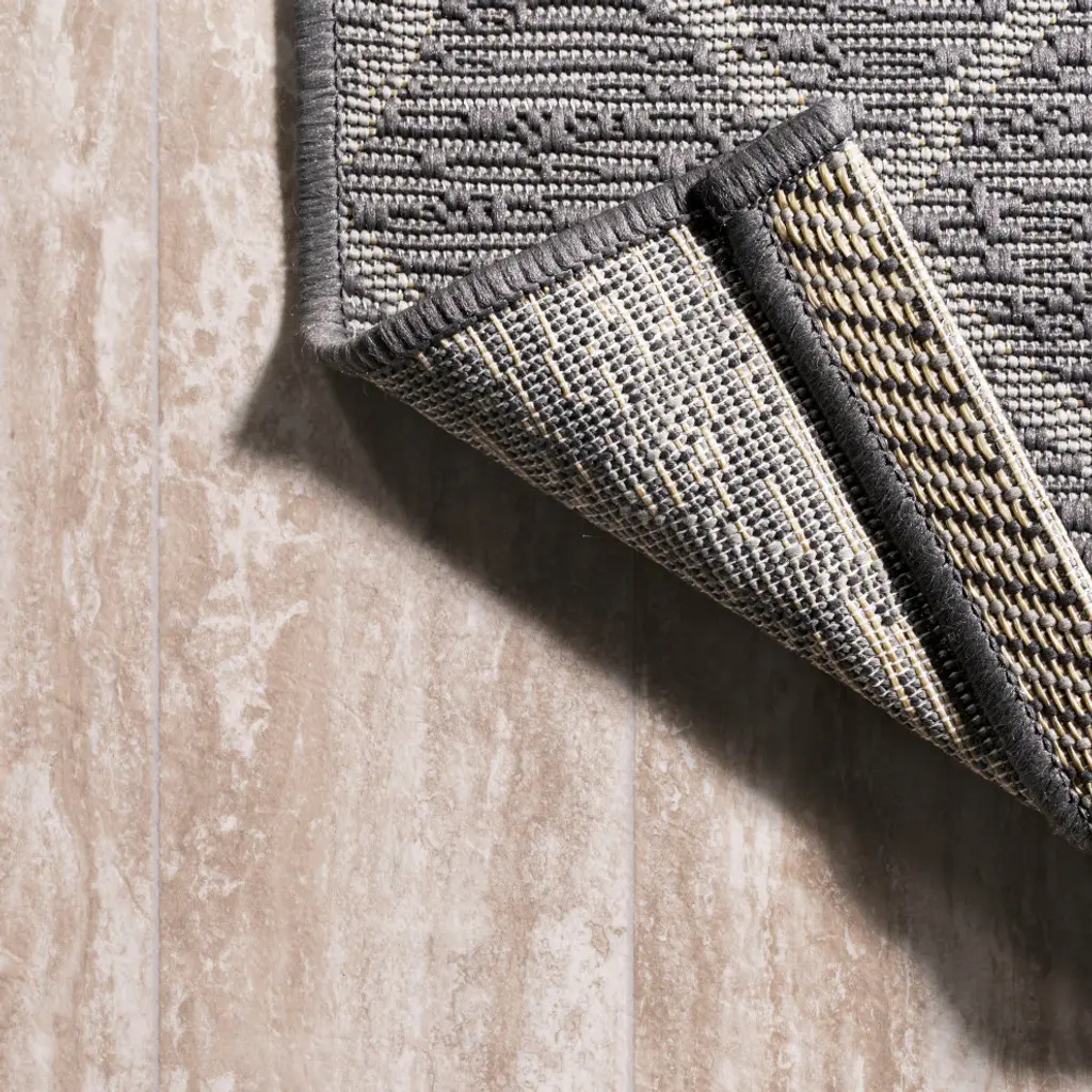 Inspired by vintage Moroccan rugs, our indoor/outdoor rug adds modern Bohemian style to your porch, patio or sunroom. The classic Moroccan pattern has a geometric design of beige diamonds on a field of dark gray. Mingled threads give this rug a handwoven, vintage vibe that''s perfect for an entry, kitchen, hallway, living room or bedroom too. The pet-friendly and kid-proof flatweave design makes it easy to clean, and perfect for the beach house.Features:• Power loomed with a flat pile that''s soft and durable• Woven shades of light gray and beige on a deep gray background• Made from easy-care polypropylene - just sweep, vacuum or hose down with mild soap and water• 100% Polypropylene• No backing, use of rug pad is recommended (sold separately)• Power Loomed in Turkey• Actual Dimension: 5 ft. 3 in. x 7 ft. 7 in.• Color: Gray/Cream• Thickness measures: 0.19 in.• Available in multiple sizes and/or colorsRug Care:• Vacuum regularly and spot clean as needed; avoid direct and continuous exposure to sunlight; use brushless vacuum; remove spills immediately; if liquid, blot with clean, undyed cloth by pressing firmly around the spill to absorb as much as possible; for hard to remove stains, professional rug cleaning is recommended; store in a dry, well ventilated area and rotate for consistent wear• Packing and shipping may cause temporary creases in rugs, which will flatten out after a week on the floor; to expedite the process, try back-rolling your rug before laying it down, and then allow ample time for the remaining creases to relax• Please Note: Due to differences in monitors, some rug colors may vary slightly. Lengths and widths may vary from the published dimensions. Patterns may vary slightly according to shape and size selected.