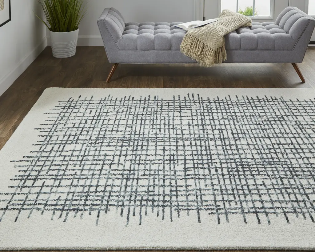 Collection: Maddox Colors: Ivory, Gray, Black Construction: Hand Tufted Material: Face: 100%Wool / Warp: Cotton Pile: Medium Pile Pile Height: 0.6" Styles: Transitional,Casual Backing: Cotton Made In: India Thickness: 0.6" Price Range: $$$$$ (Affordable)