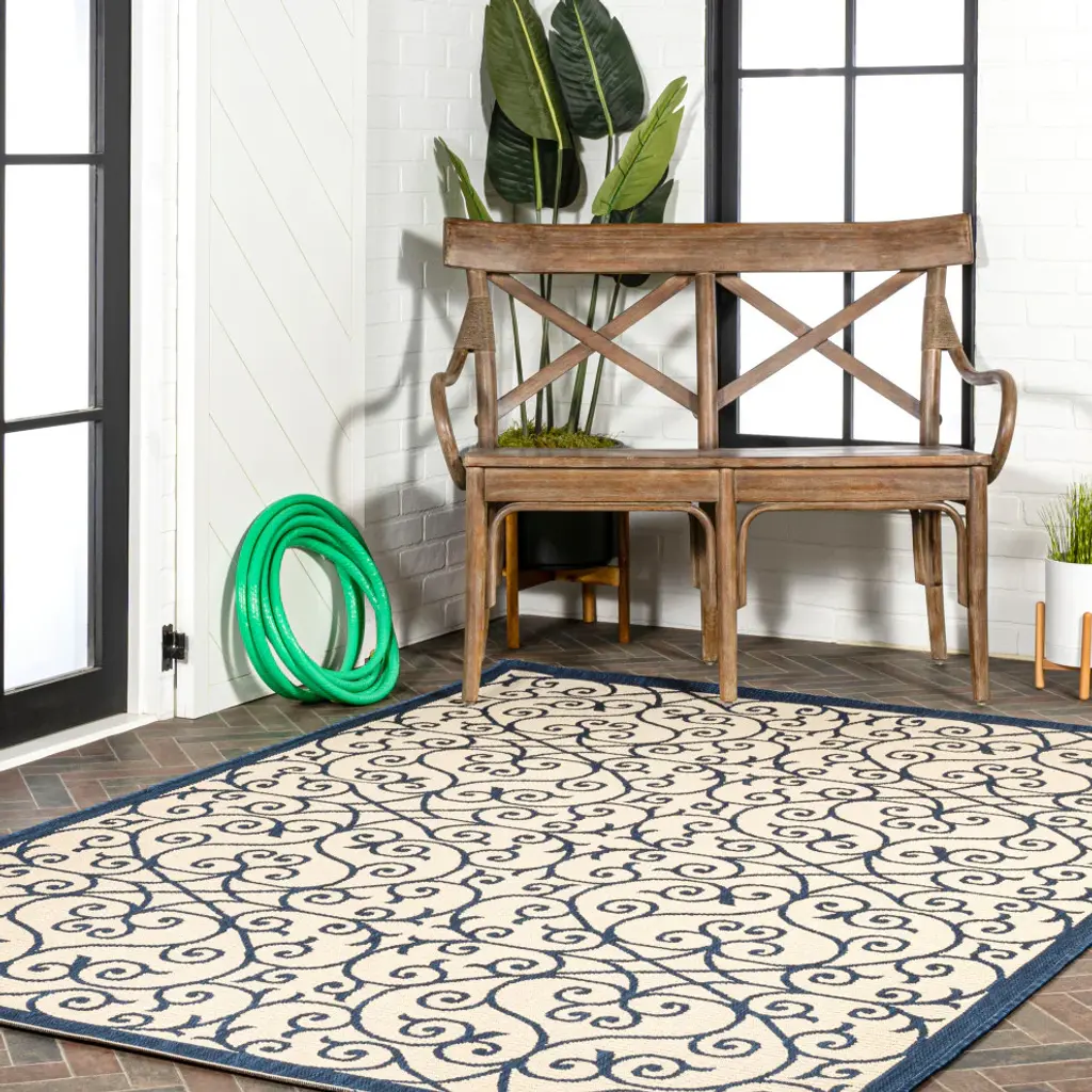 With its filigree design inspired by Spanish wrought iron, our Boho-chic rug adds eclectic style to an outdoor porch or patio. Varied tones of beige and brown mingled with a black pattern give this rug a hand-woven, vintage vibe. The flatweave design is great for high-traffic spaces indoors too.Features:• Flat-weave construction of 100% polypropylene• Light gray and black with a handwoven mingled texture• Water resistance with 0.19" pile• 100% Polypropylene• No backing, use of rug pad is recommended (sold separately)• Power Loomed in Turkey• Actual Dimension: 9 ft. x 12 ft.• Color: Navy/Beige• Thickness measures: 0.19 in.• Available in multiple sizes and/or colorsRug Care:• Vacuum regularly and spot clean as needed; avoid direct and continuous exposure to sunlight; use brushless vacuum; remove spills immediately; if liquid, blot with clean, undyed cloth by pressing firmly around the spill to absorb as much as possible; for hard to remove stains, professional rug cleaning is recommended; store in a dry, well ventilated area and rotate for consistent wear• Packing and shipping may cause temporary creases in rugs, which will flatten out after a week on the floor; to expedite the process, try back-rolling your rug before laying it down, and then allow ample time for the remaining creases to relax• Please Note: Due to differences in monitors, some rug colors may vary slightly. Lengths and widths may vary from the published dimensions. Patterns may vary slightly according to shape and size selected.About us:Style your floors with JONATHAN Y. By combining fine craftsmanship and design, this New York creative studio is bringing fashion to your floors. The collection mixes sustainable organic materials, vibrant colors and trend worthy styles to create JONATHAN Y''s distinctive catalog of rugs.