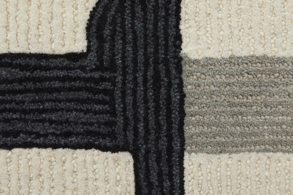 Collection: Maguire Colors: Ivory, Gray, Black Construction: Hand Tufted Material: Face: Wool, Nylon Pile: Medium Pile Pile Height: 0.62" Styles: Transitional,Industrial,Mid-Century Modern Backing: N/A Made In: India Thickness: 0.62" Price Range: $$$$$ (Affordable)