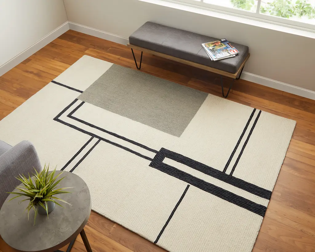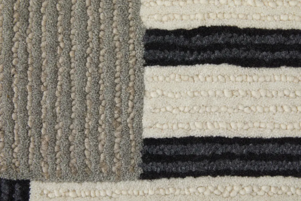 Collection: Maguire Colors: Ivory, Gray, Black Construction: Hand Tufted Material: Face: Wool, Nylon Pile: Medium Pile Pile Height: 0.62" Styles: Transitional,Industrial,Mid-Century Modern Backing: N/A Made In: India Thickness: 0.62" Price Range: $$$$$ (Affordable)