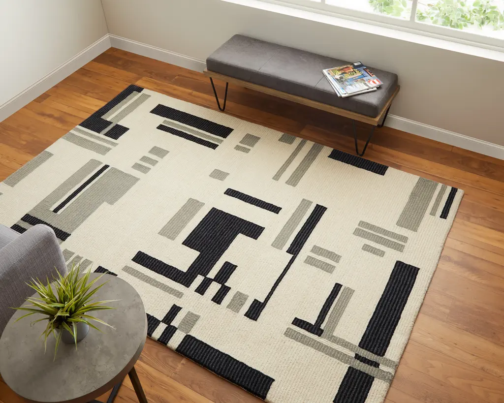 Collection: Maguire Colors: Ivory, Taupe Construction: Hand Tufted Material: Face: Wool, Nylon Pile: Medium Pile Pile Height: 0.62" Styles: Transitional,Industrial,Mid-Century Modern Backing: N/A Made In: India Thickness: 0.62" Price Range: $$$$$ (Affordable)