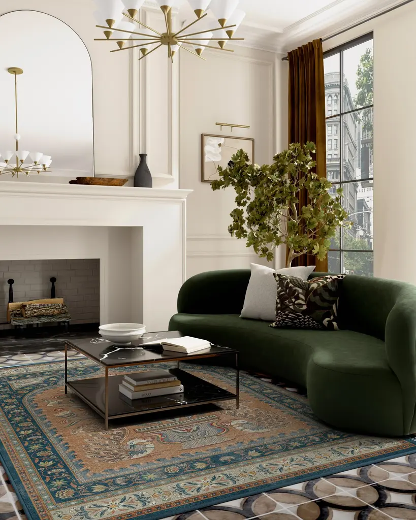 Welcome home majestic beauty with our Martyn Lawrence Bullard Mahal Multicolor Rug. Inspired by traditional woven Indian tapestries, this modern design features symmetric peacock motifs surrounding an elaborate floral bush, and intricate borders, creating an ethereal ambiance. The rich color palette, with variants of blues, creams, reds, pinks, golds, terracotta, and sage greens, is beautifully highlighted by pops of yellows and light creams against a coral background. Water-resistant, stain-resistant, and machine-washable. Rug colors may vary slightly according to your device and the lighting in your space.