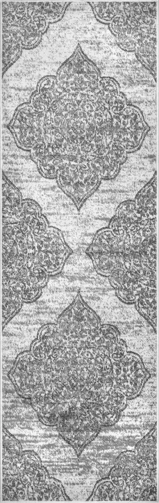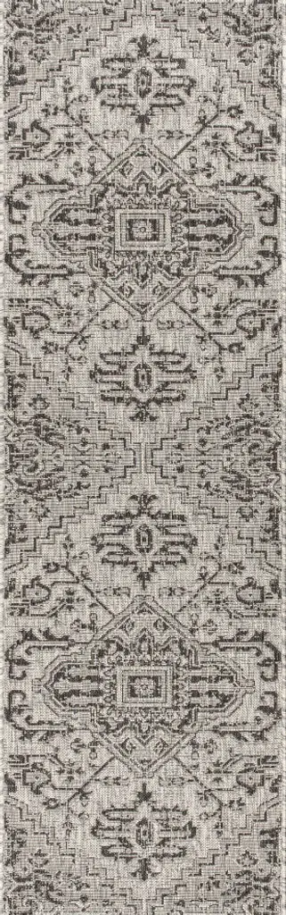 An intricate and elegant design. This traditional rug features a border pattern with delicate flowers and leaves in black on a natural tan background. It is made from a washable woven material that has a jute-like texture. Made with recycled + virgin polyester, and polyurethane.