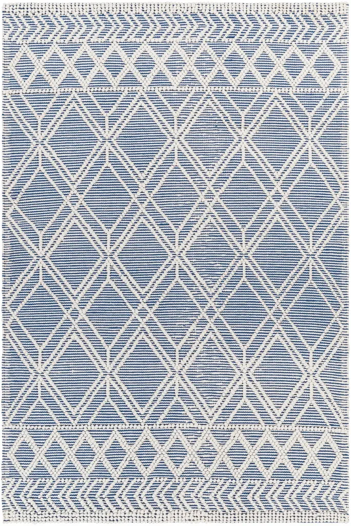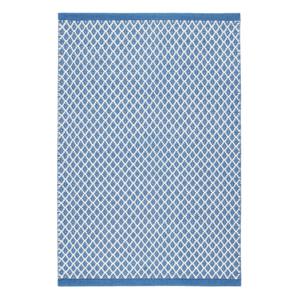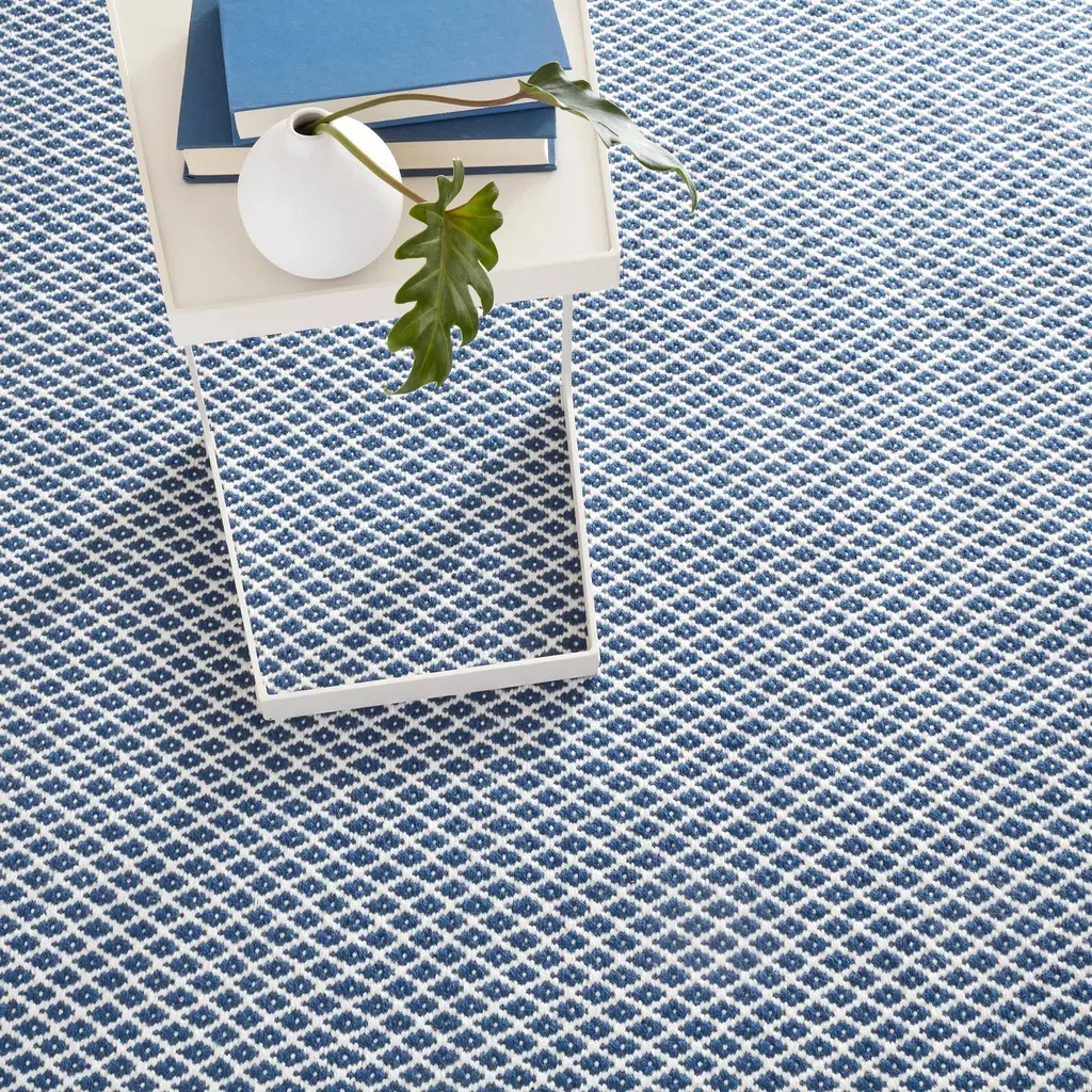 A classic lattice diamond in versatile blue and ivory color combo offers subtle geometric interest on a durable and washable floor covering. Made of eco-friendly 100% PET, a soft-handed fiber from recycled plastic bottles.