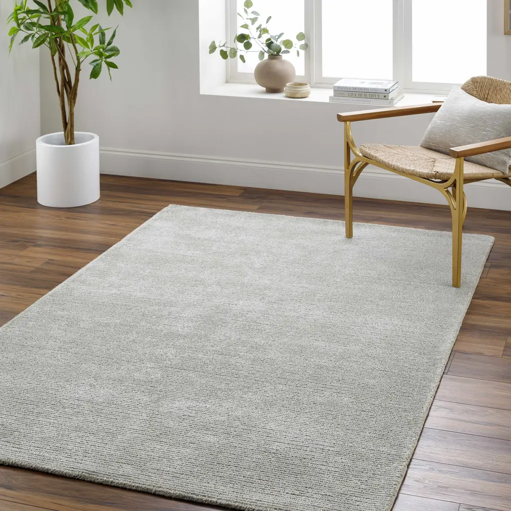 Collection: Makya Colors: Silver Gray Construction: Hand Tufted Material: 65% Viscose,35% Wool Pile: Medium Pile Pile Height: 0.3" Styles: Contemporary Backing: Canvas Made In: India Thickness: 0.5" Price Range: $$$$$ (Affordable)