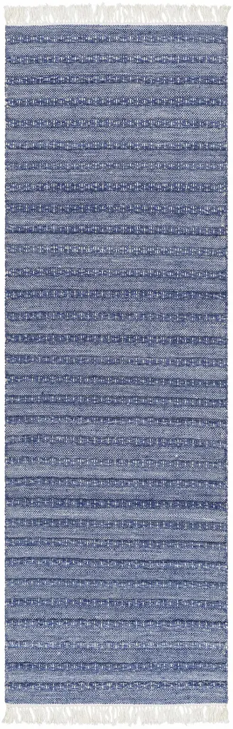 Collection: Mala Colors: Denim, Ivory, White, Navy Construction: Hand Woven Material: 100% Recycled PET Yarn Pile: No Pile Styles: Contemporary Made In: India Thickness: 0.25" Fringe Length: 3" Price Range: $$$$$ (Most Affordable)