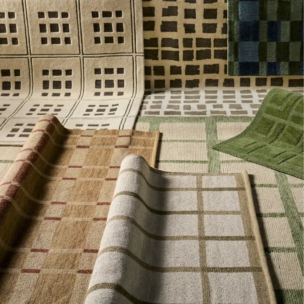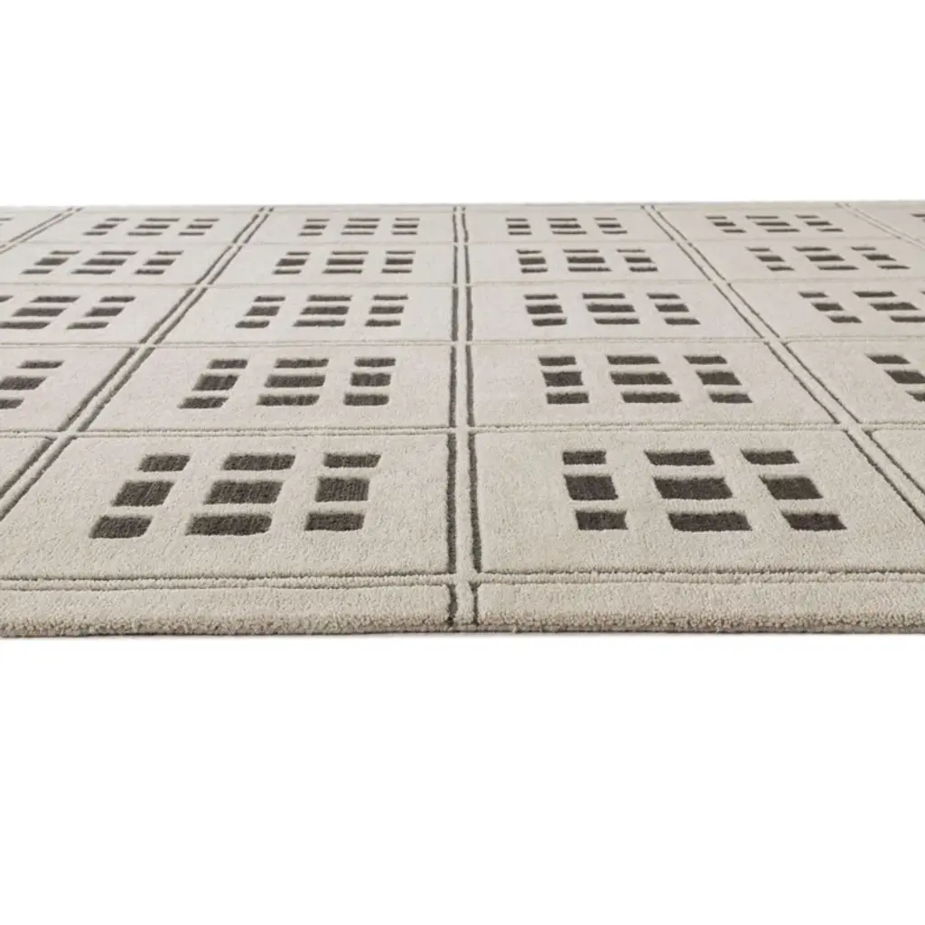 This hand-tufted wool rug features a structured grid pattern with a contemporary twist, making it a bold statement piece for modern interiors. The cream-colored base is accented with charcoal geometric detailing, creating a clean, architectural look. Crafted from 100% wool, this rug provides a soft yet durable texture, offering both comfort and longevity. The cut-and-loop pile enhances dimension, while the minimalist design ensures versatility across different spaces.
