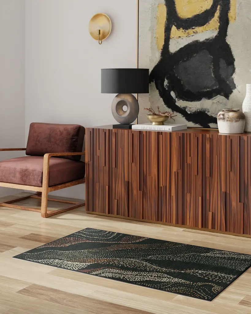 Step into a world of cultural richness and artistic expression with our Malene Barnett Adorned Black Multicolor Rug. Inspired by the intricate body art traditions of the Nuba people, this expressive design features a repeated textural dotted pattern arranged organically. Movement and visual interest are heightened through repetition of the rustic red, orange, gold, pastel green, sage green, and cream motifs. A striking black background solidifies the palette, creating a perfect tapestry of color and texture. Water-resistant, stain-resistant, and machine-washable. Rug colors may vary slightly according to your device and the lighting in your space.