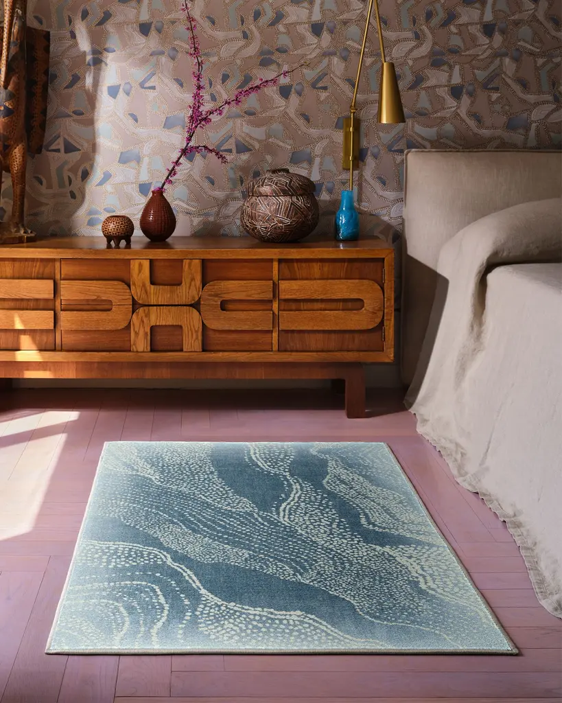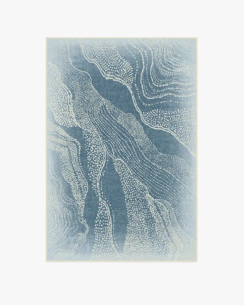 Step into a world of cultural richness and artistic expression with our Malene Barnett Adorned Soft Blue Rug. Inspired by the intricate body art traditions of the Nuba people, this expressive design features a repeated textural dotted pattern arranged organically, gradually transitioning into an ombre effect. Movement and visual interest are heightened through repetition of the light cream motifs against a soft blue gradient background. Water-resistant, stain-resistant, and machine-washable. Rug colors may vary slightly according to your device and the lighting in your space.